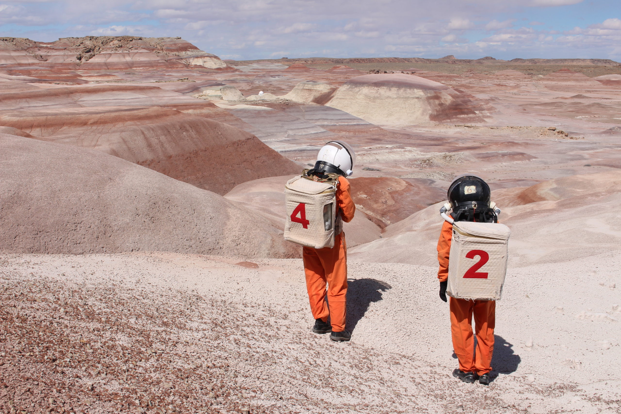 Artists Ella Good and Nicki Kent in astronaut suits at the Mars Desert Research Station, Utah. Pic: Satori Photos