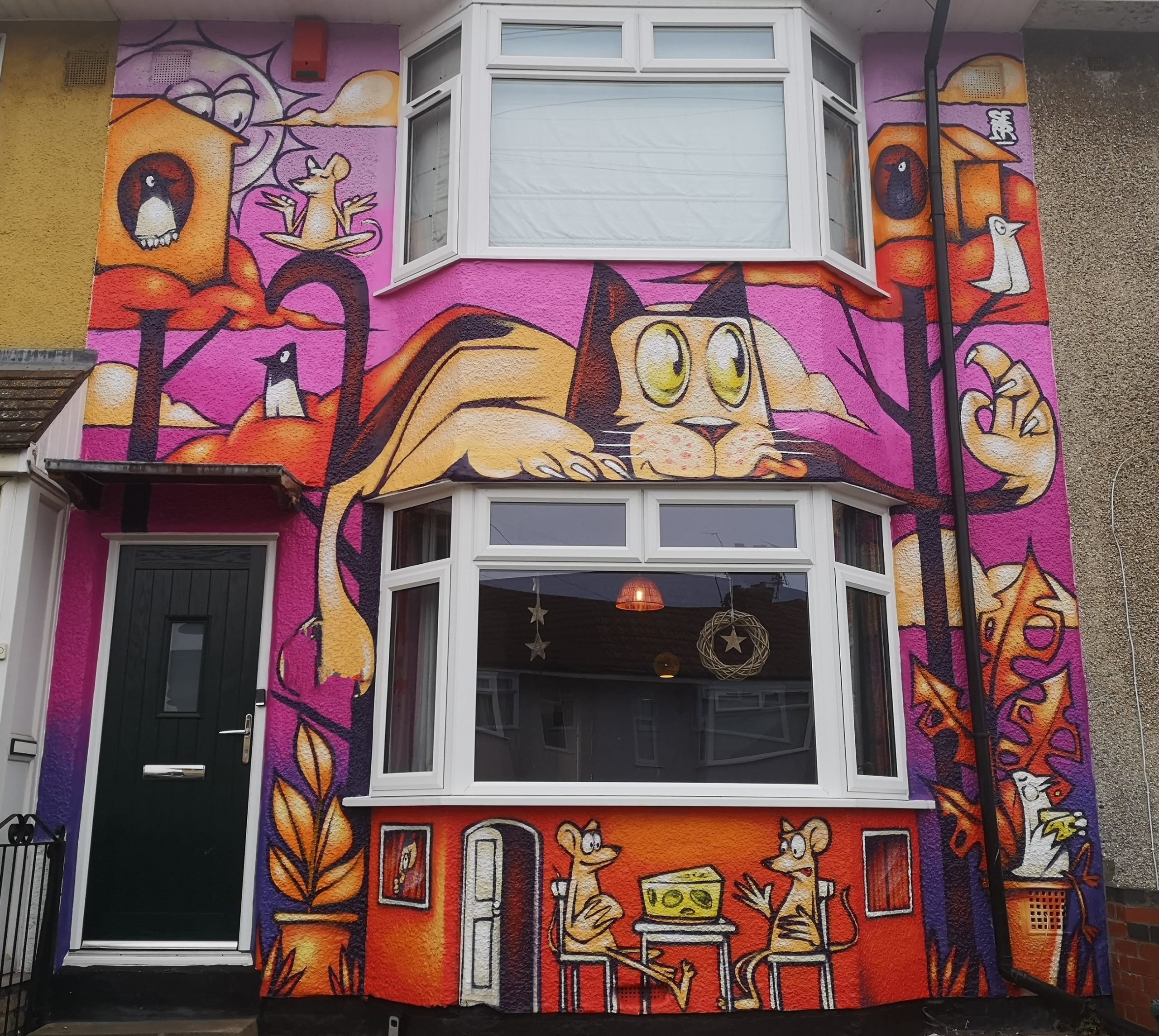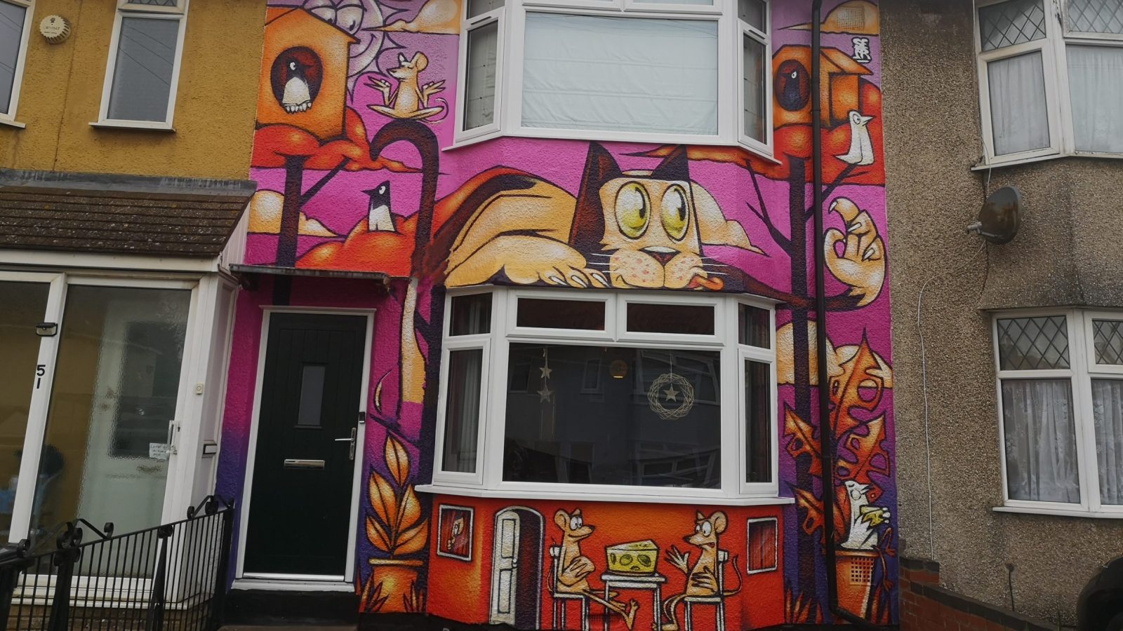 The vibrant work, which features dining mice and a towering feline figure, was painted on the front of a house in Filton by artist Shaun Sepr.