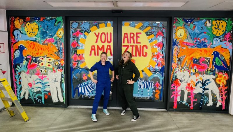 Sisters Dr Sarah Moore and Emily Powell in front of Powell’s mural on the doors of Great Ormond Street Hospital