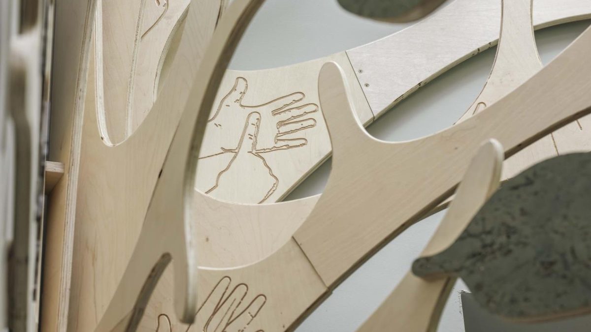 Hand in Hand by Cathy Mager features two tree-like structures with branches etched in BSL and trunks imprinted with handprints.