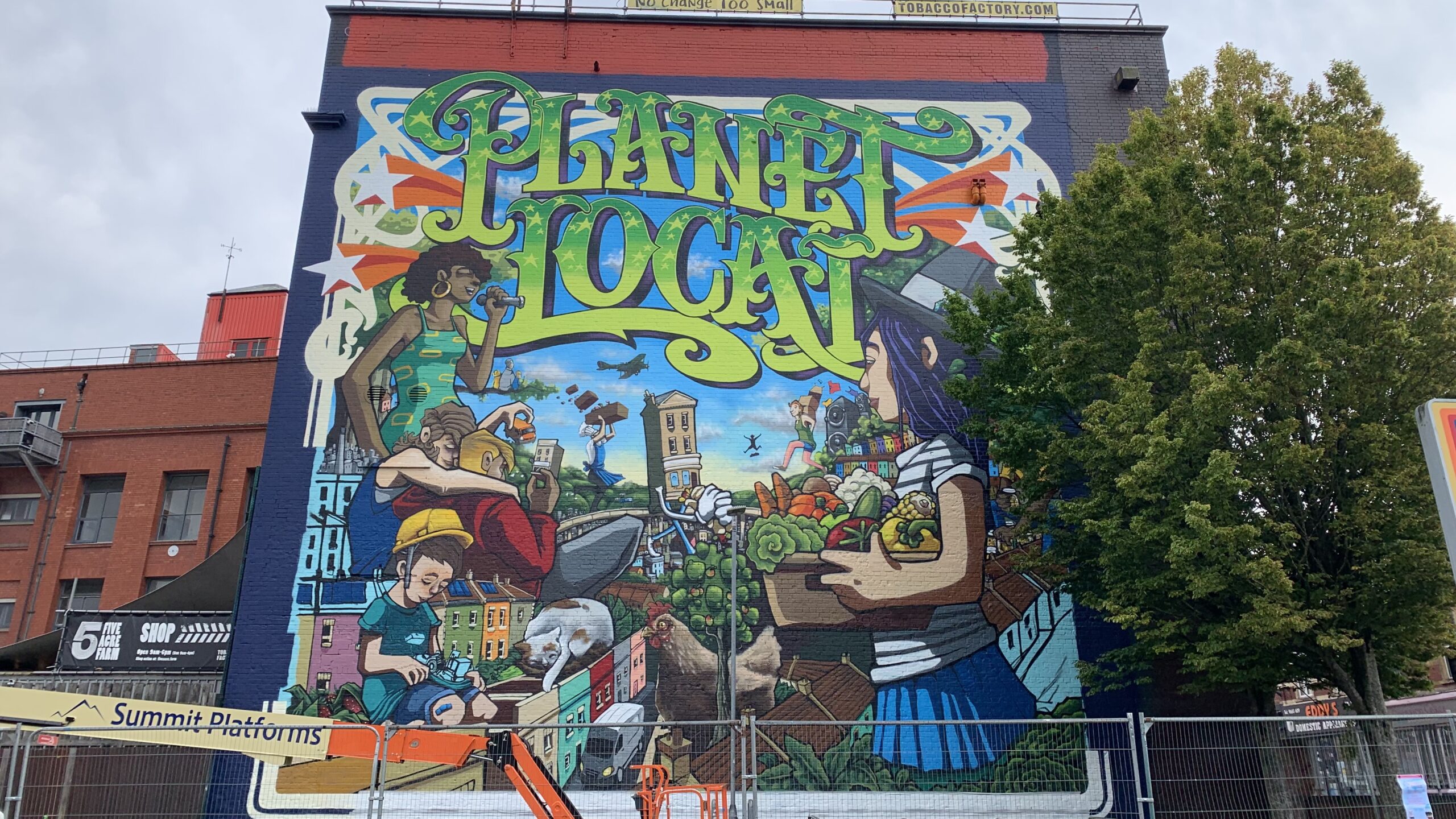 Inkie and the finished street art on Ashton Fruit Shop – photo: Joanna Stopford