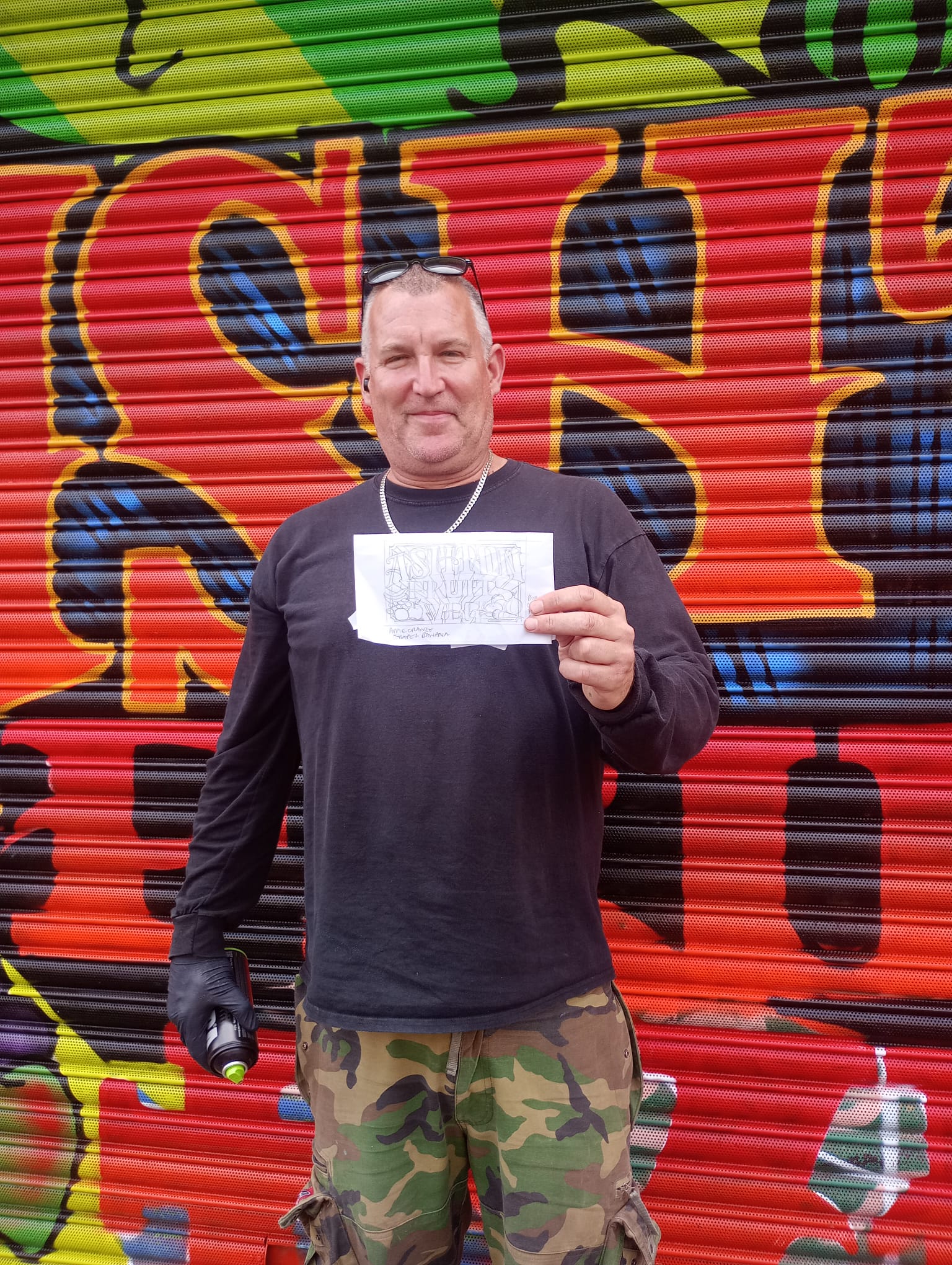 Inkie and the sketch he does to prepare to freehand the art – photo: Joanna Stopford