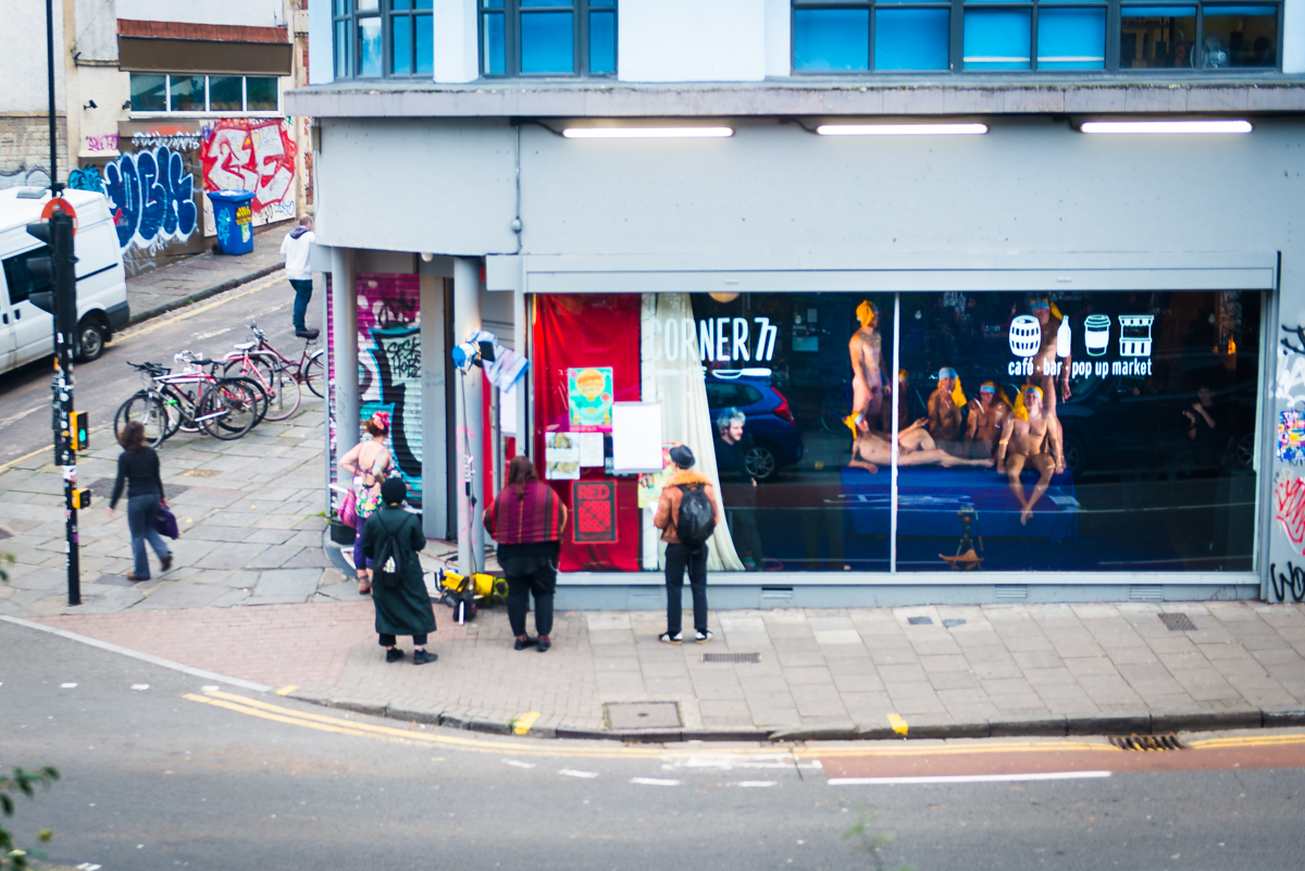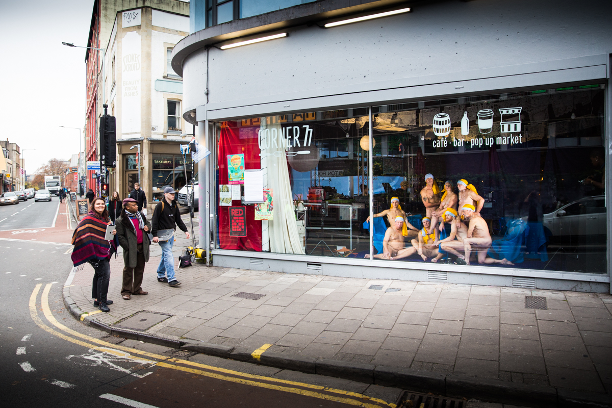 More than a dozen naked men and women appeared in the window of a Stokes Croft restaurant for two hours on a recent afternoon, with passers-by encouraged to strip off and join in.