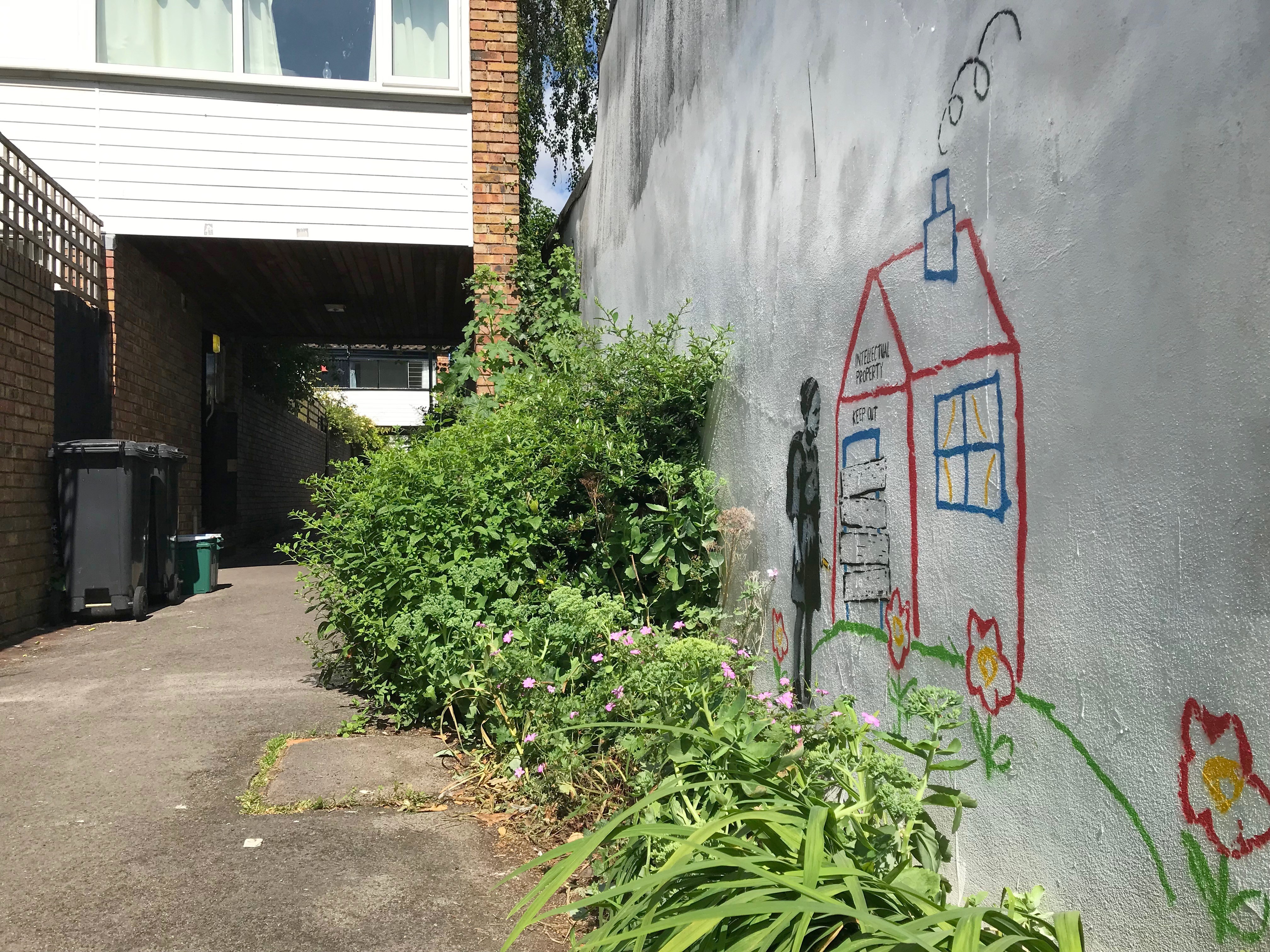 The work is a reference to a piece that Banksy painted in Los Angeles in 2011 called Crayon House Foreclosure.