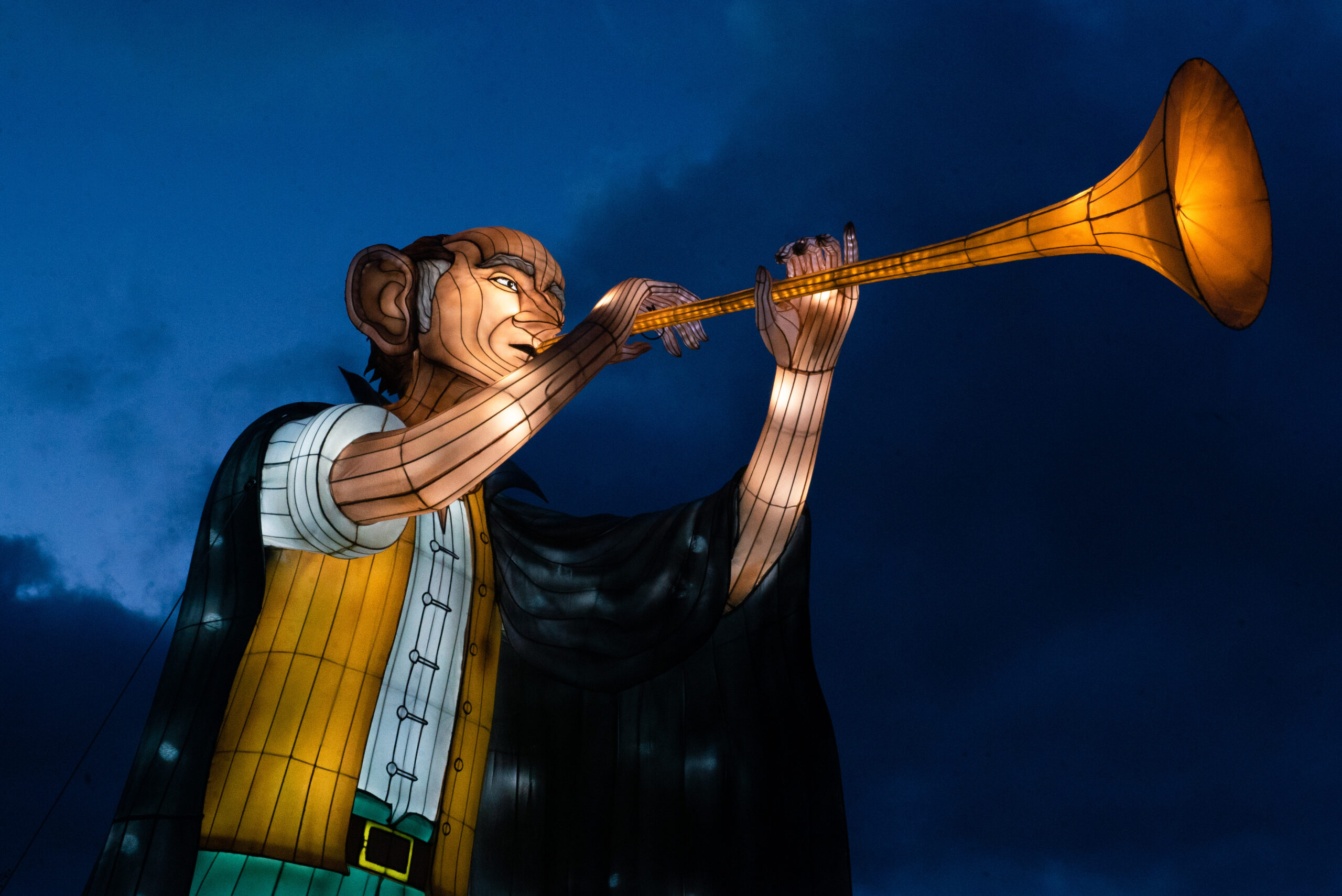 The 5-metre-tall BFG plays his horn against the night sky – photo: Ella Calland