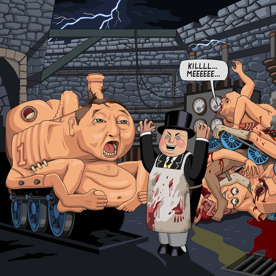 Hey Jim, could you please paint Thomas The Tank Engine, made of flesh (except for his wheels) with a face that reflects the agony of being twisted into the shape of a train. While the Fat Controller laughs beside a pile of failed flesh locomotive experiments? Cheers,