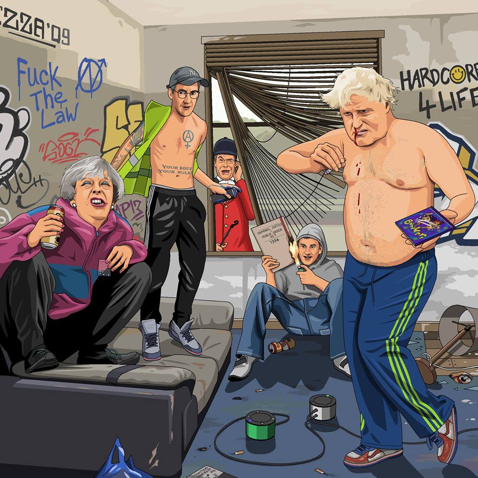 Tory squat party. Boris has a nosebleed from snorting too much speed, May is drinking special brew and Hunt is burning the Criminal Justice Bill while Farage, in full hunting gear, is calling the police. As requested by Matt Durstan Tilke.