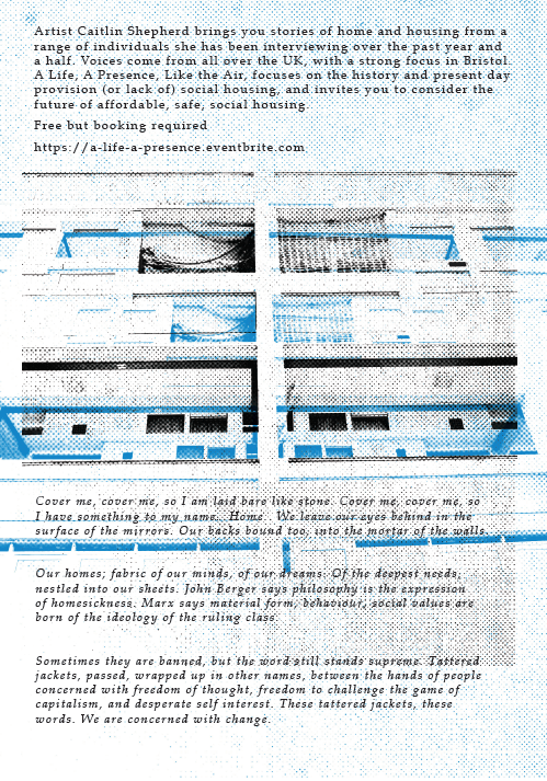 Specifically, I’m interested in situating A Life, A Presence, Like the Air (and my other work, which is all to do with stories of home and housing in some way) in residential, social housing spaces – where the work directly interplays with the fabric of home.I like to locate my work in the residential areas where I have spent time speaking with residents, and collecting their stories of work, home, money, dreams, family, and personal triumphs and struggles that have marked their lives with significance.