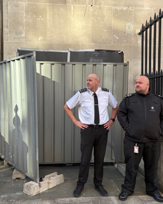 Two officers are seen guarding the now-boarded up Banksy artwork – Palestine Lobby