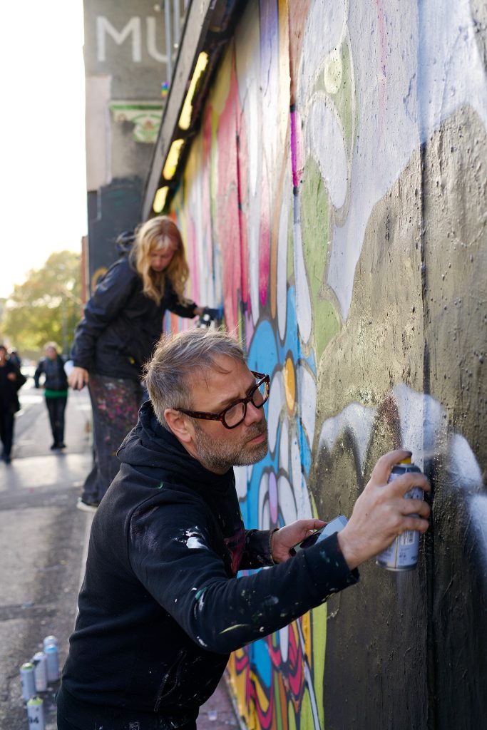From left to right, Aimes Was Here’s section of the wall features a Big Issue seller, Melo incorporates a blue BillyChip token in her signature style, Jody has painted a black and white portrait of James Hype, and Conrico’s portion reimagines a community of micro-homes within natural surroundings.