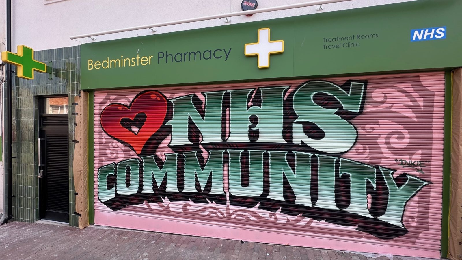 One of Bristol’s best-known artists, Inkie, has painted the words ‘NHS community’ in his signature style outside Bedminster Pharmacy on East Street.