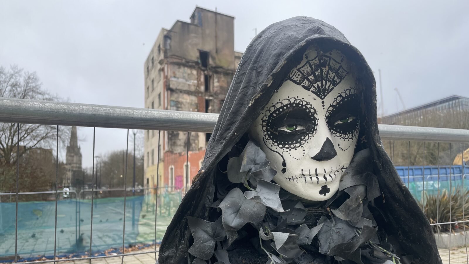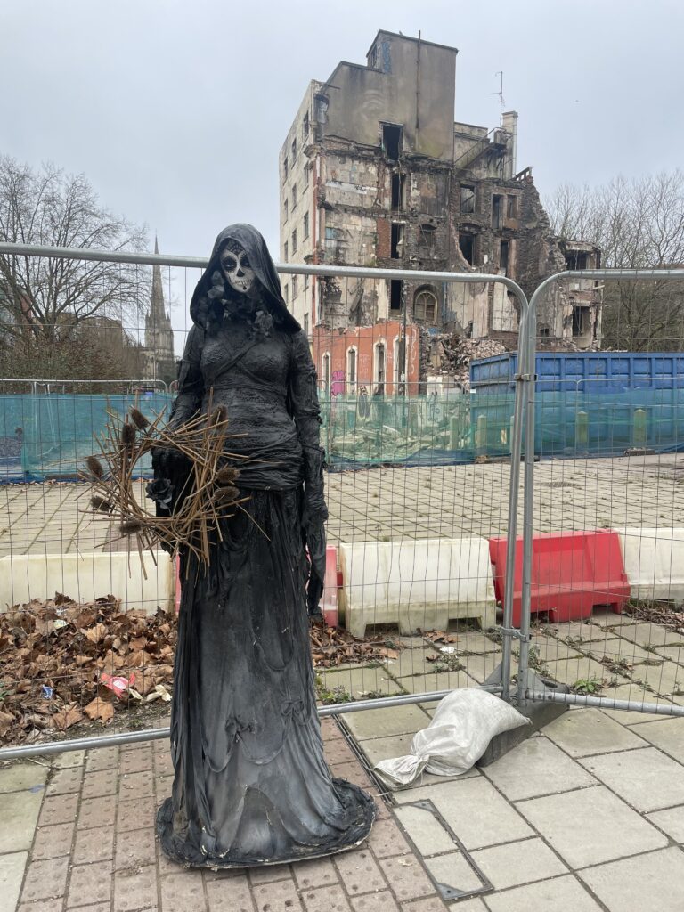 A sculpture of a catrina has been placed next to the Grosvenor Hotel, whose 1930s extension remains standing following demolition of most of the original red-brick Victorian building over the weekend.