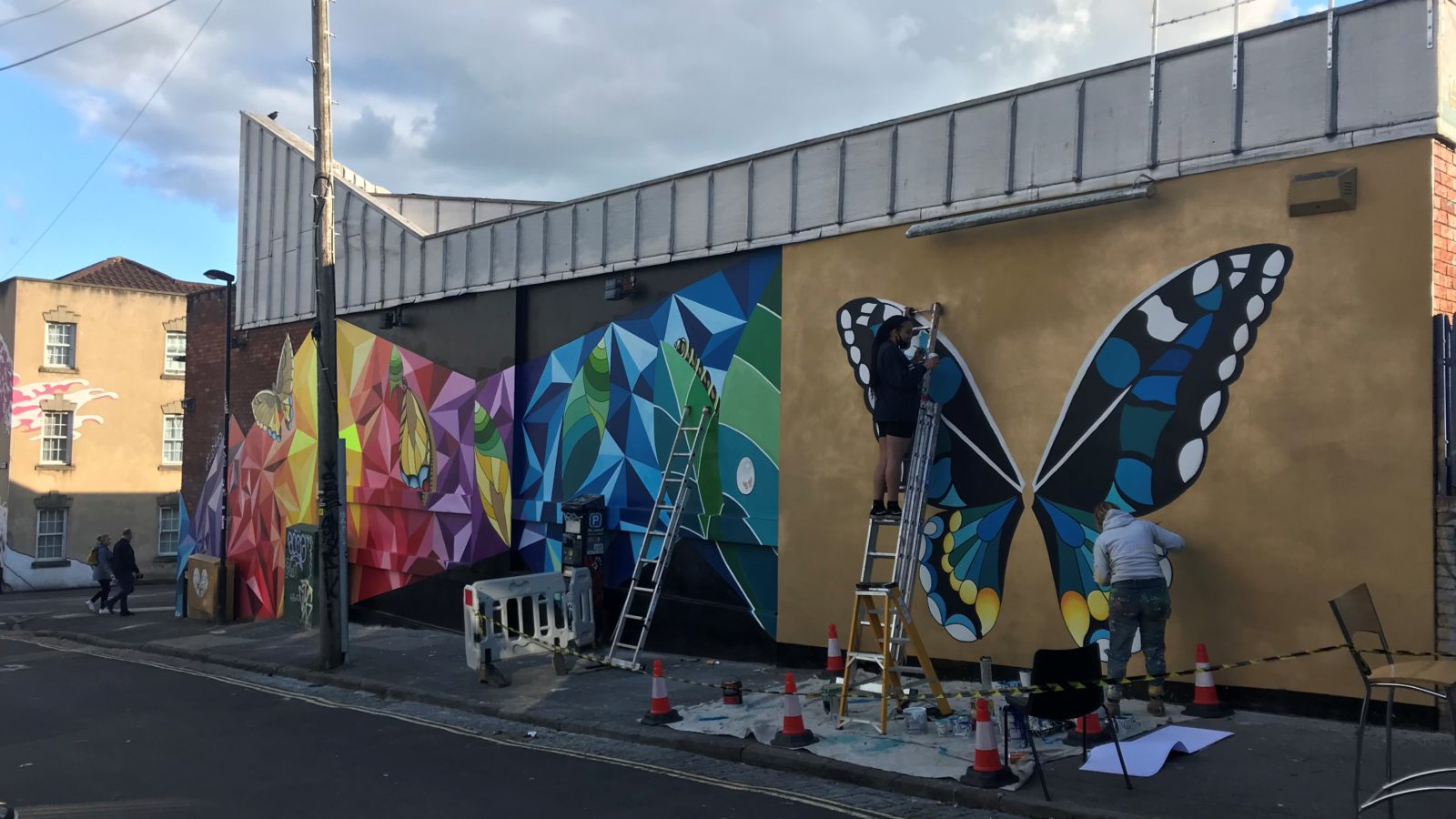 The finishing touches are being put to a huge mural on the side of a church in Stokes Croft.