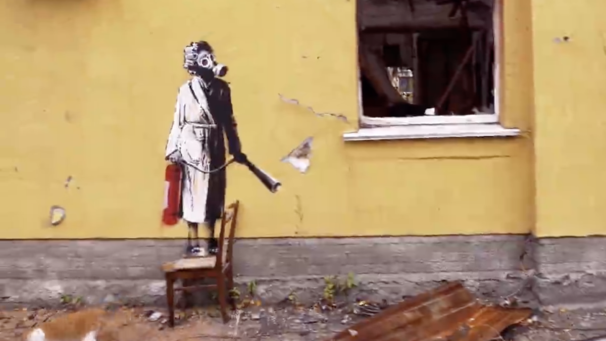 People try to steal Banksy mural of gas-masked woman from Ukraine wall