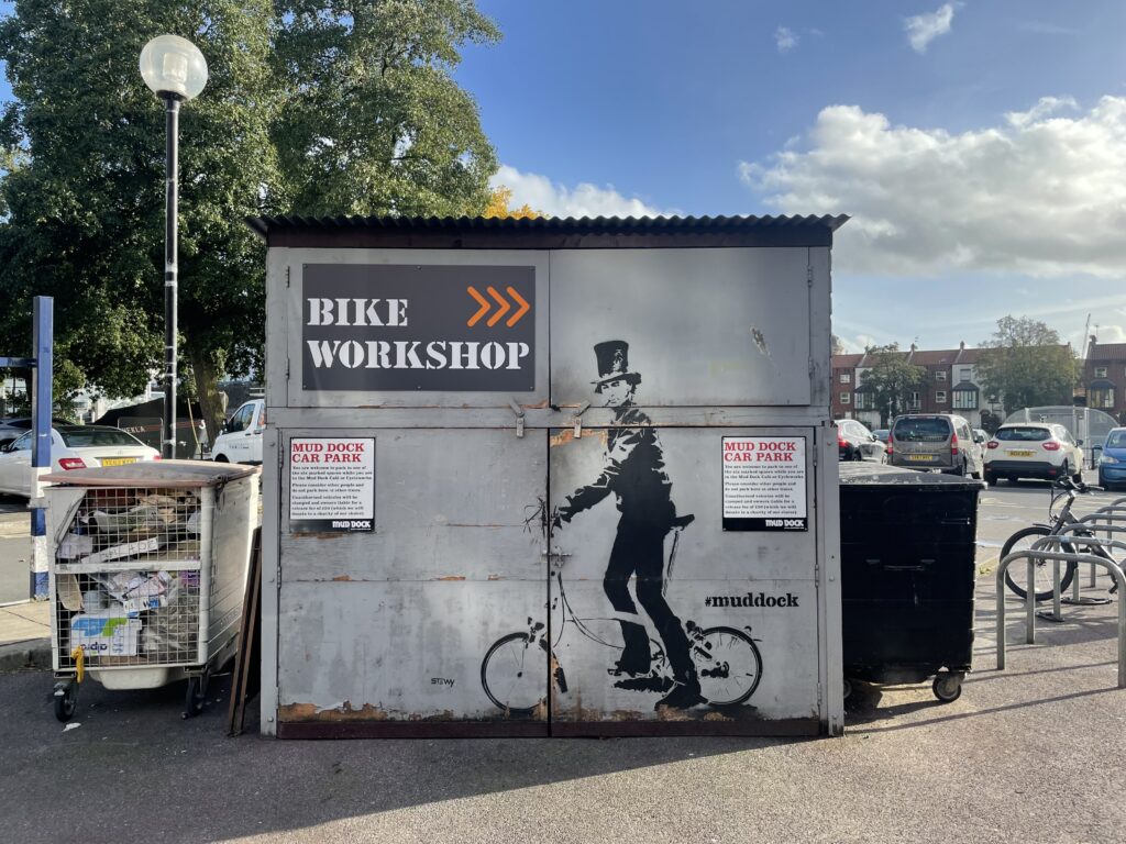 Stewy’s stencil of Brunel on a Brompton is next to Mud Dock bike shop – photo: Martin Booth