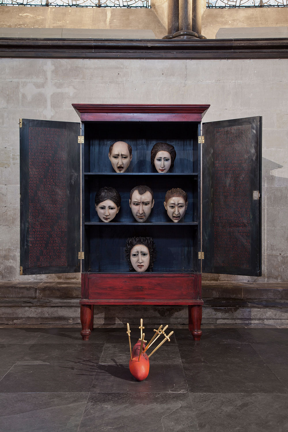 The cabinet recalls the Portuguese oratório, a domestic devotional altar containing items associated with a saint, sometimes with prayers inscribed. On the doors of this oratório is a quotation from a contemporary Brazilian poem (by José Lobo) describing the fate of the victims of colonisation robbed of their memory: Olhos vazados / Sexos castrados / Chumbo nos ouvidos / Mãos arrancadas (“Eyes poked out / Genitals cut off / Shot in the ears / Hands severed”).