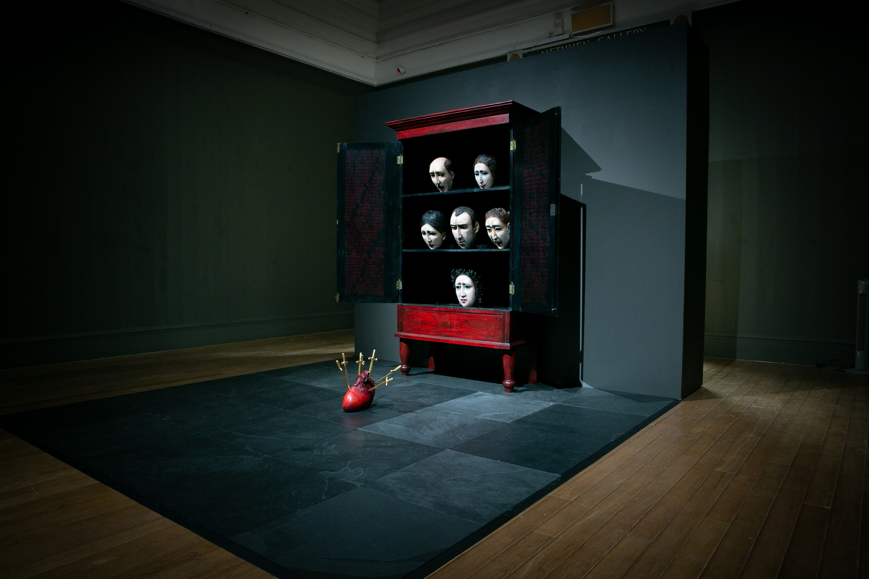 Ana’s work is evolved from a tradition of making which lies between South American and European culture, between ancient magic and twentieth century art. The piece we are very excited to have as part of our exhibition is called Memória Roubada I. A cabinet contains six disembodied heads (not severed, as there is no trace of a neck and the eyes are alive) that focus in a range of emotions on the pierced heart before them. Images of the Seven Sorrows of Mary, which gained currency in the Counter Reformation, show seven swords, each representing a sorrow that pierces Mary’s heart. Here swords are replaced by daggers with all their connotations of violent betrayal.
