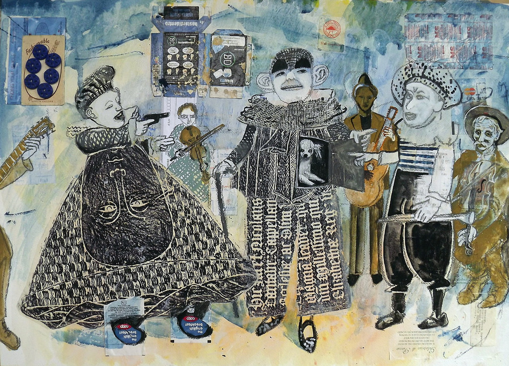 Three Clowns by Ros Cuthbert, 2014, collage, gouache & watercolour