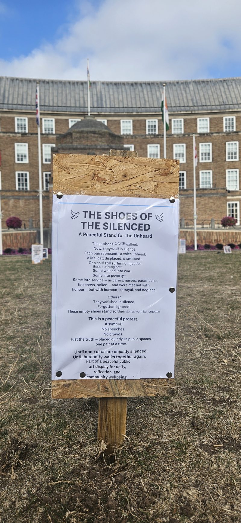 On one of the boards outside City Hall, the author wrote: “These shoes once walked. Now they wait in silence.