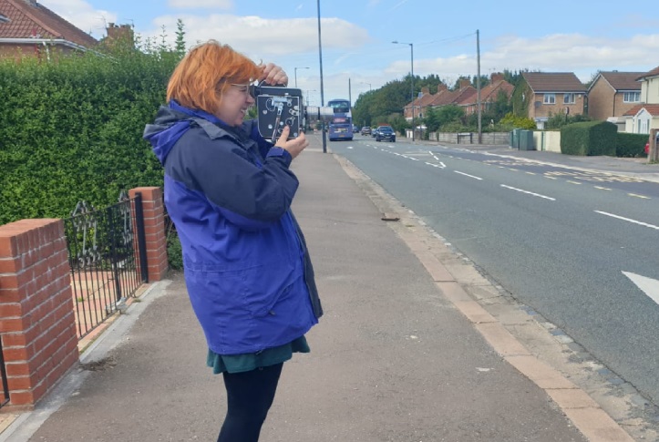 Artist Laura Phillips on Pen Park Road with her clockwork camera – photo: Laura Phillips