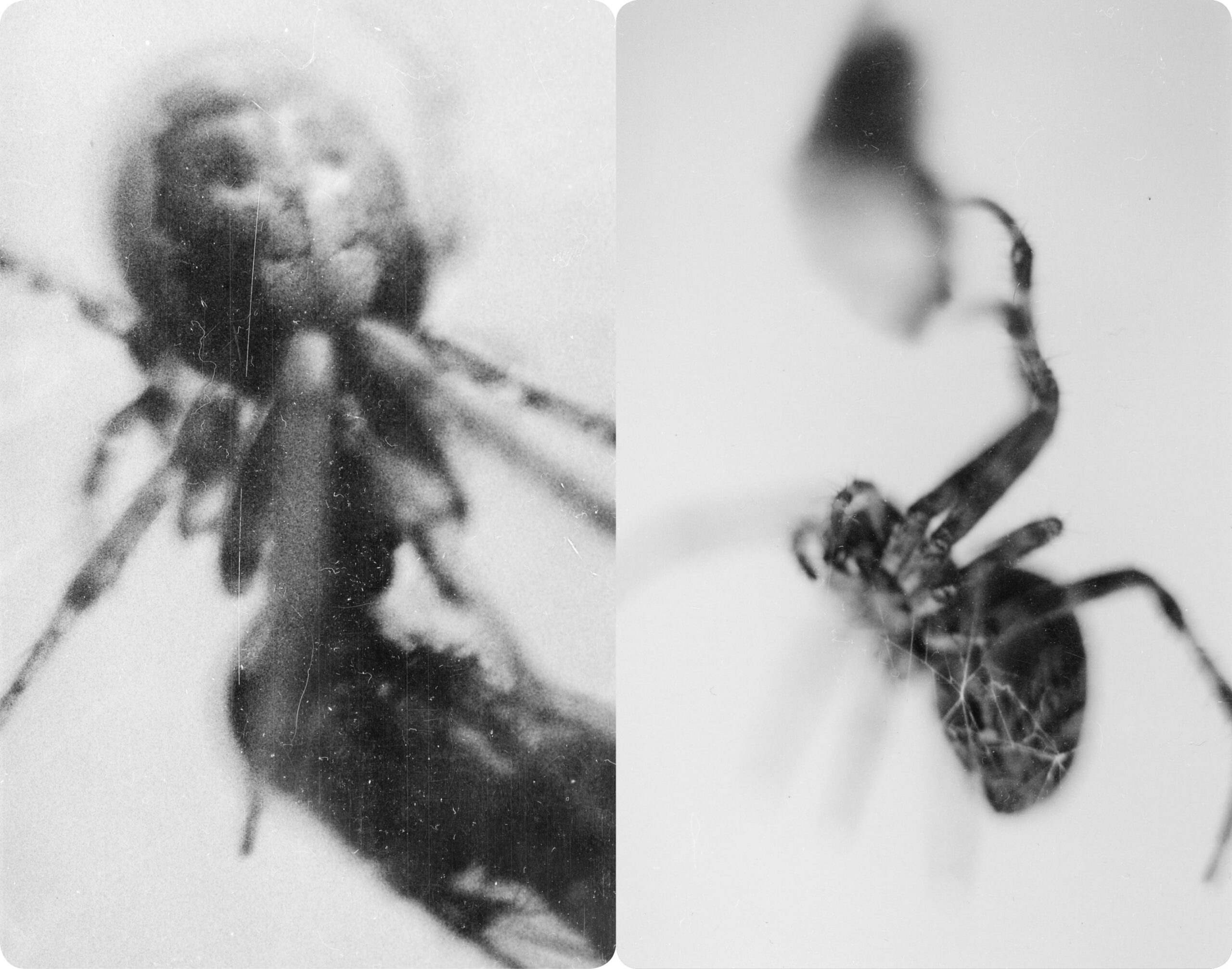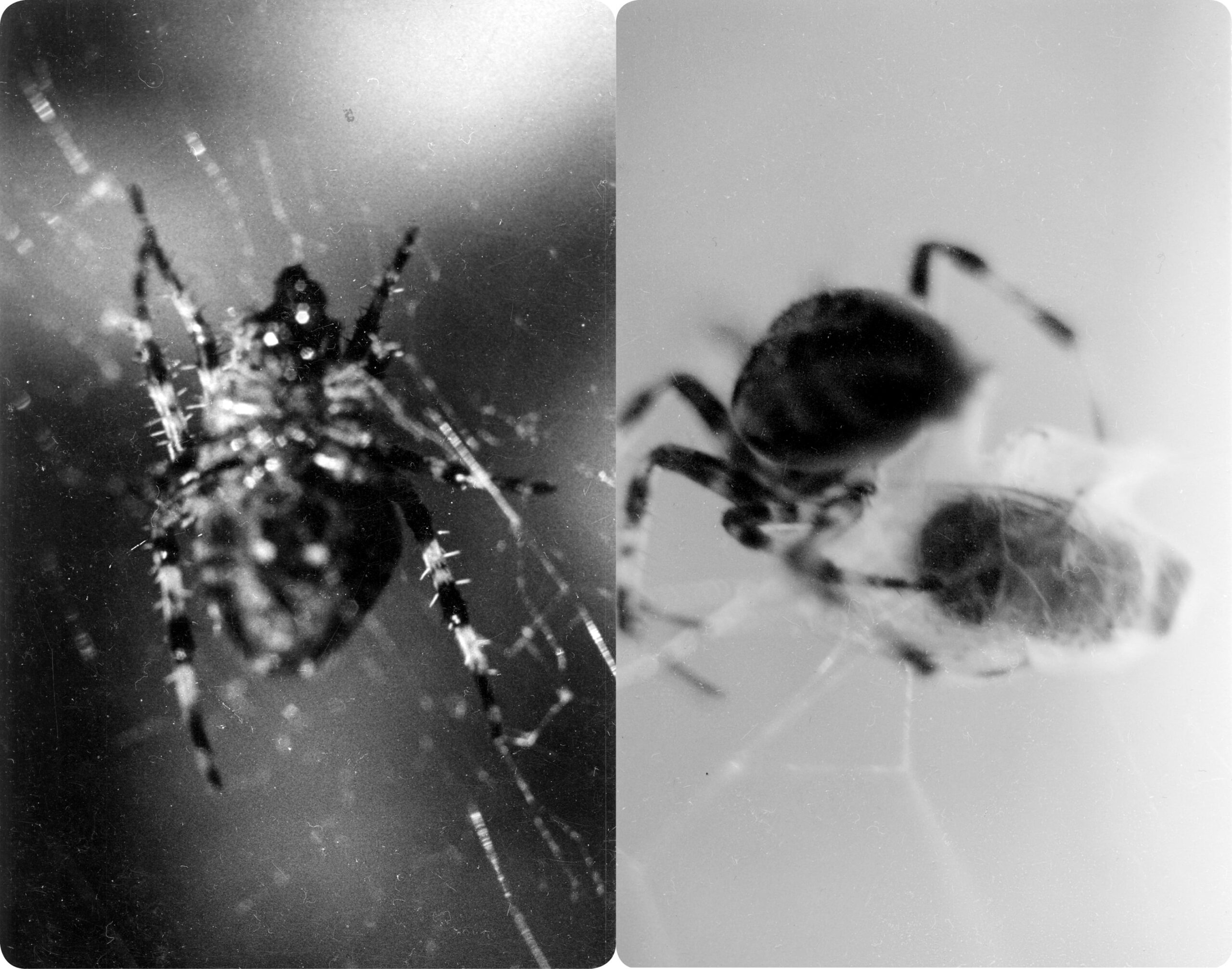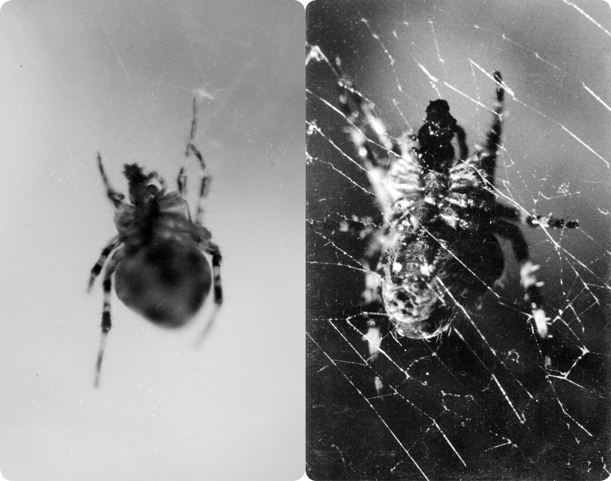 A series of nine pairs of silver-geltin prints, Clayton’s images are a photographic exploration of a period of time in the Darkroom of the artist’s former home in Brighton, which was also adopted by a large number of garden spiders.
