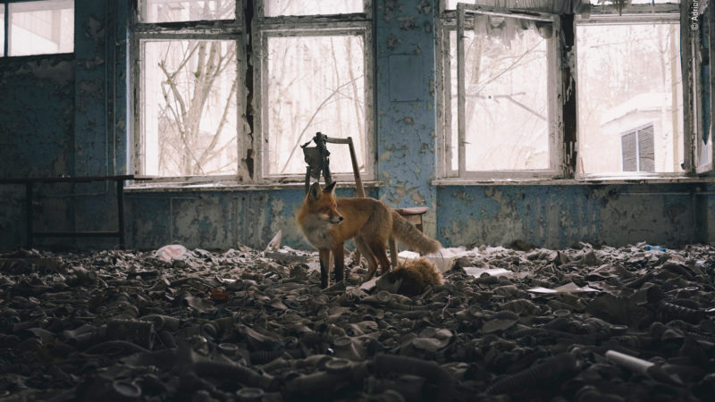 The city lies within the 30-kilometre (19-mile) exclusion zone, which only accredited individuals can enter, and in the absence of humans, the forest is moving back in. Animals such as wild boar, deer, moose and lynx are making a comeback, and there are even sightings of brown bears and wolves. Though there were areas of the zone that Adrian was advised not to enter because radiation levels were still too high, and though the long-term effect of radiation on the animals is far from clear, wildlife appears to be thriving.