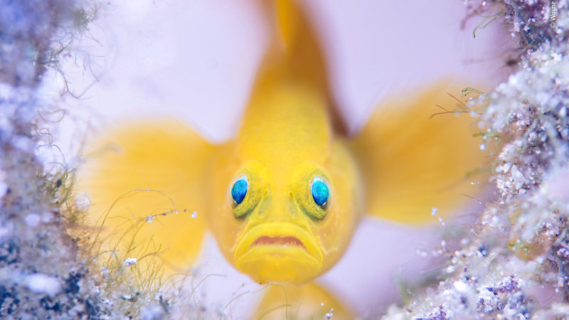 Setting up his camera a few centimetres in front of the bottle’s narrow opening, Wayne positioned his two strobes – one at the base of the bottle to illuminate the interior, and the other at the front to light the goby’s characteristic surprised face. Opting for a shallow depth of field, Wayne focused on the goby’s bulging blue eyes, allowing the movement of the fish to blur the rest of its features into a haze of yellow, and framing its portrait with the circular entrance to the bottle.