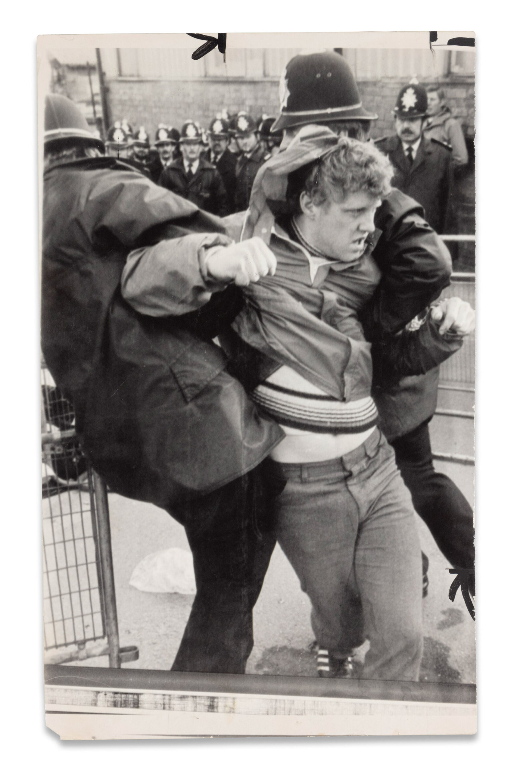 A policeman getting to grips with a picket, 1984 – press print: © Neville Pyne