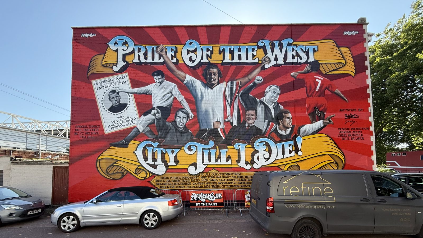 The mural features typography by Inkie spelling out ‘Pride of the West’ and ‘City till I die’ and famous figures from City’s past painted by Jody: John Atyeo, Paul Cheesley, Terry Cooper, Steve Cotterill, Alan Dicks, Joe Jordan, Scott Murray and Billy Wedlock.