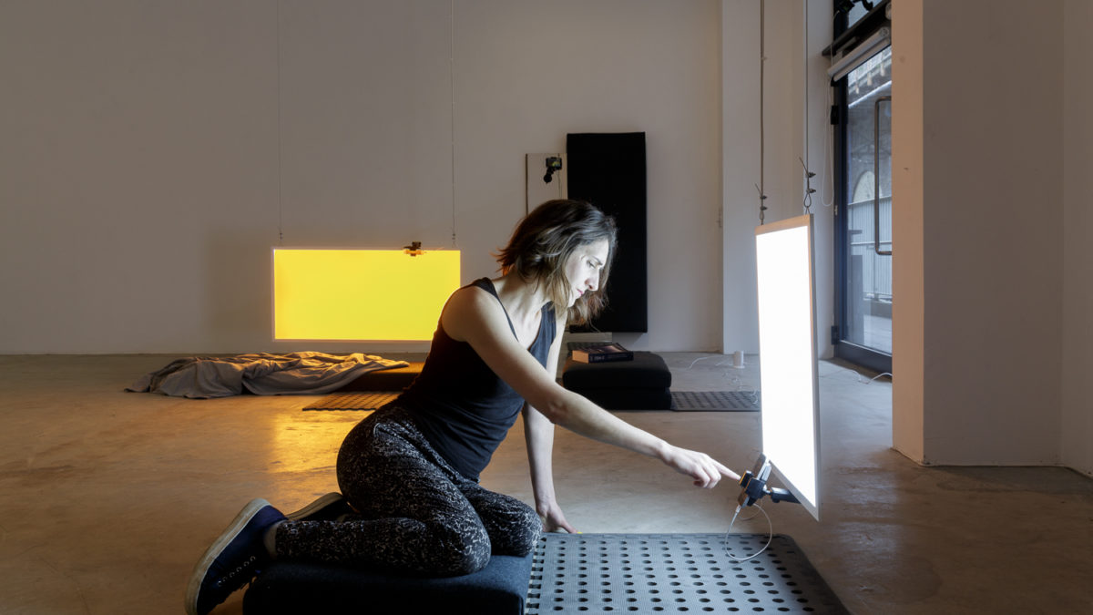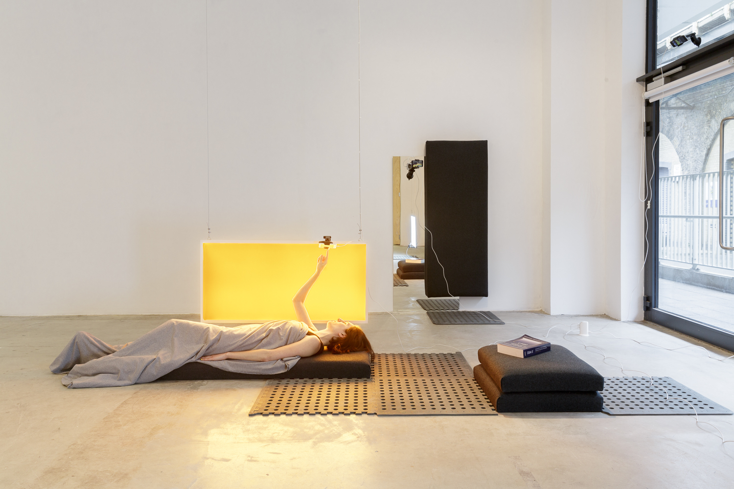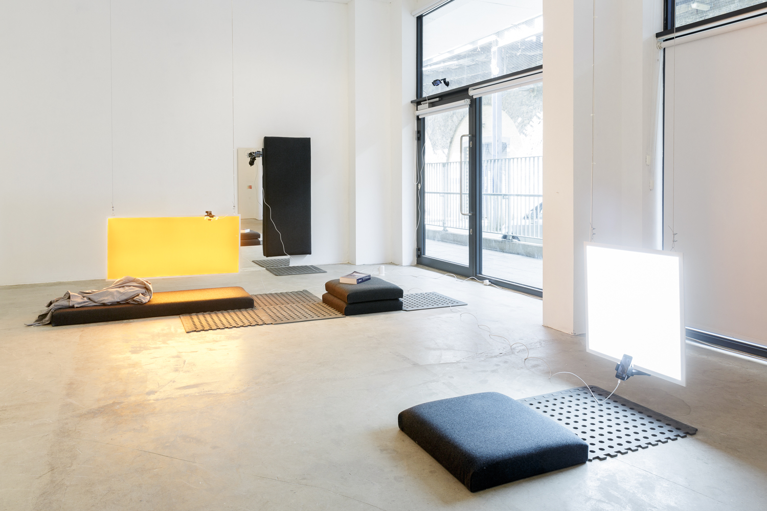 Pics: Annabelle Craven-Jones, ‘Google_Hangout_Sessions [Oxytocin_States]’, 2018. Networked installation [with furnishings (pads, mats, LED lighting panels, filter, mirror, grey marl jersey), iPhones, phone holders, USB tower, DSM5 Manual, Wi-Fi, deaddrop/ flashdrive ]. Pic by Tim Bowditch, courtesy of res. gallery London 2018
