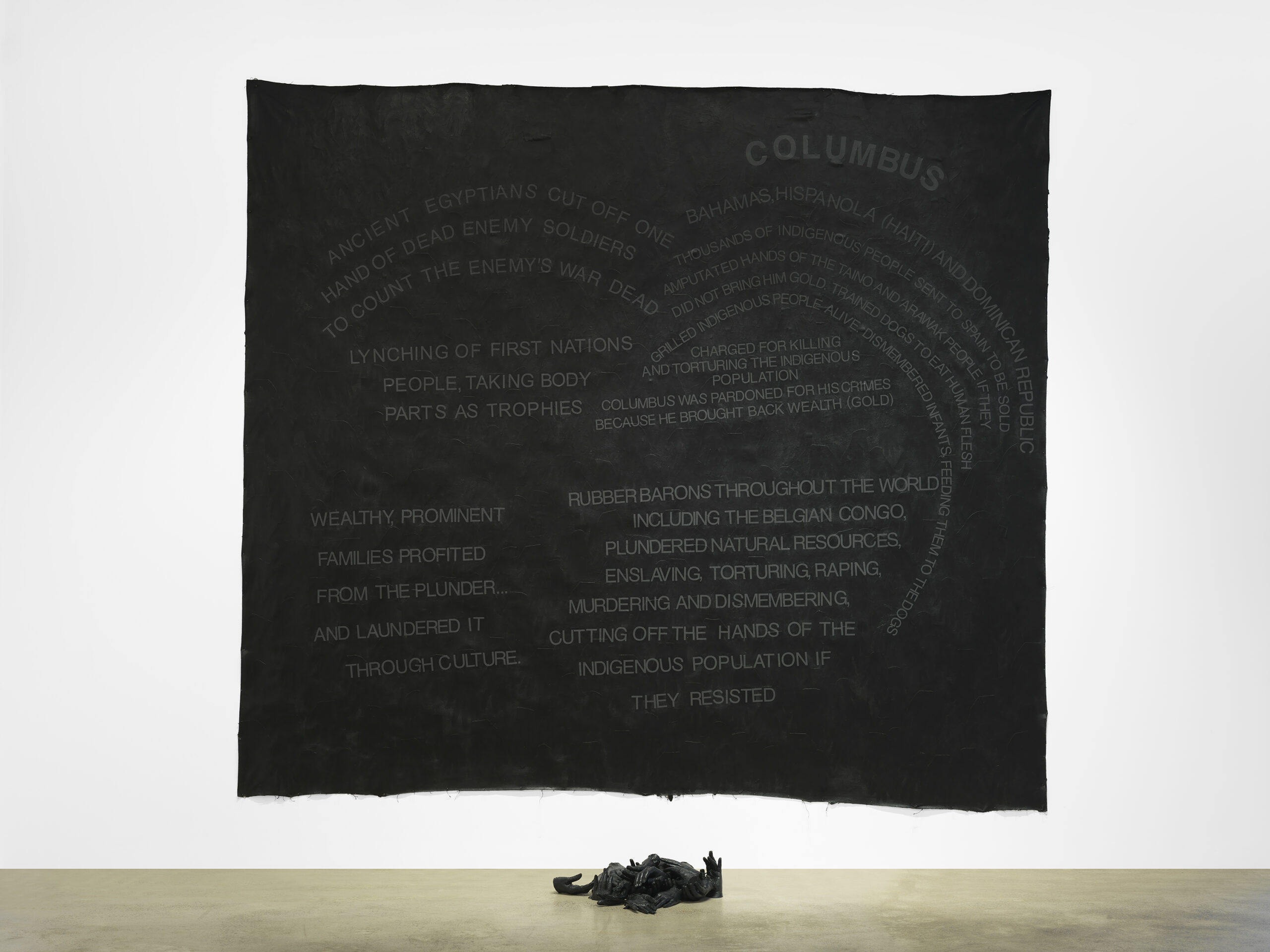 Howardena Pindell, Columbus (2020) , mixed media on canvas – photo: courtesy of the artist and Garth Greenan Gallery, New York