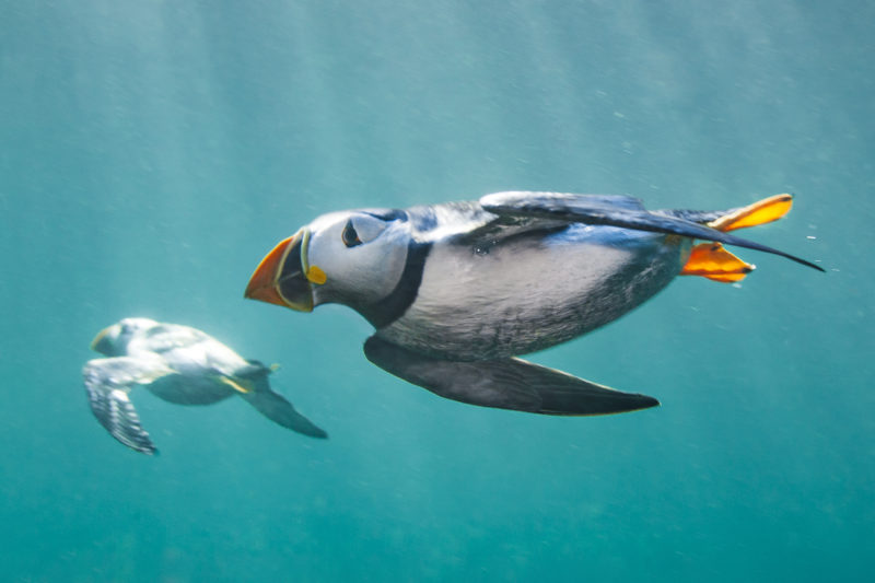 Puffins (Fratercula arctica) swimming underwater. Puffins spend most of their lives at sea and are excellent underwater swimmers, which is how they catch small fish, their main food. , Farne Islands, Northumberland. England, UK. North Sea. July – photo: Alex Mustard