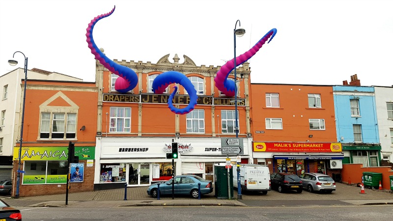 Octopus tentacles burst out the windows above a barber shop in St Paul’s, lending a B-movie-style makeover to Sussex Place.