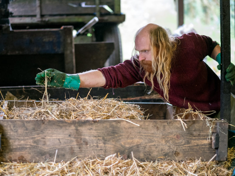 Daniel building a ‘cheese’, Pennard Organic Wines and Ciders, East Pennard, 2019, from Made out of Orchards, Martin Parr Foundation – photo: Tessa Bunney