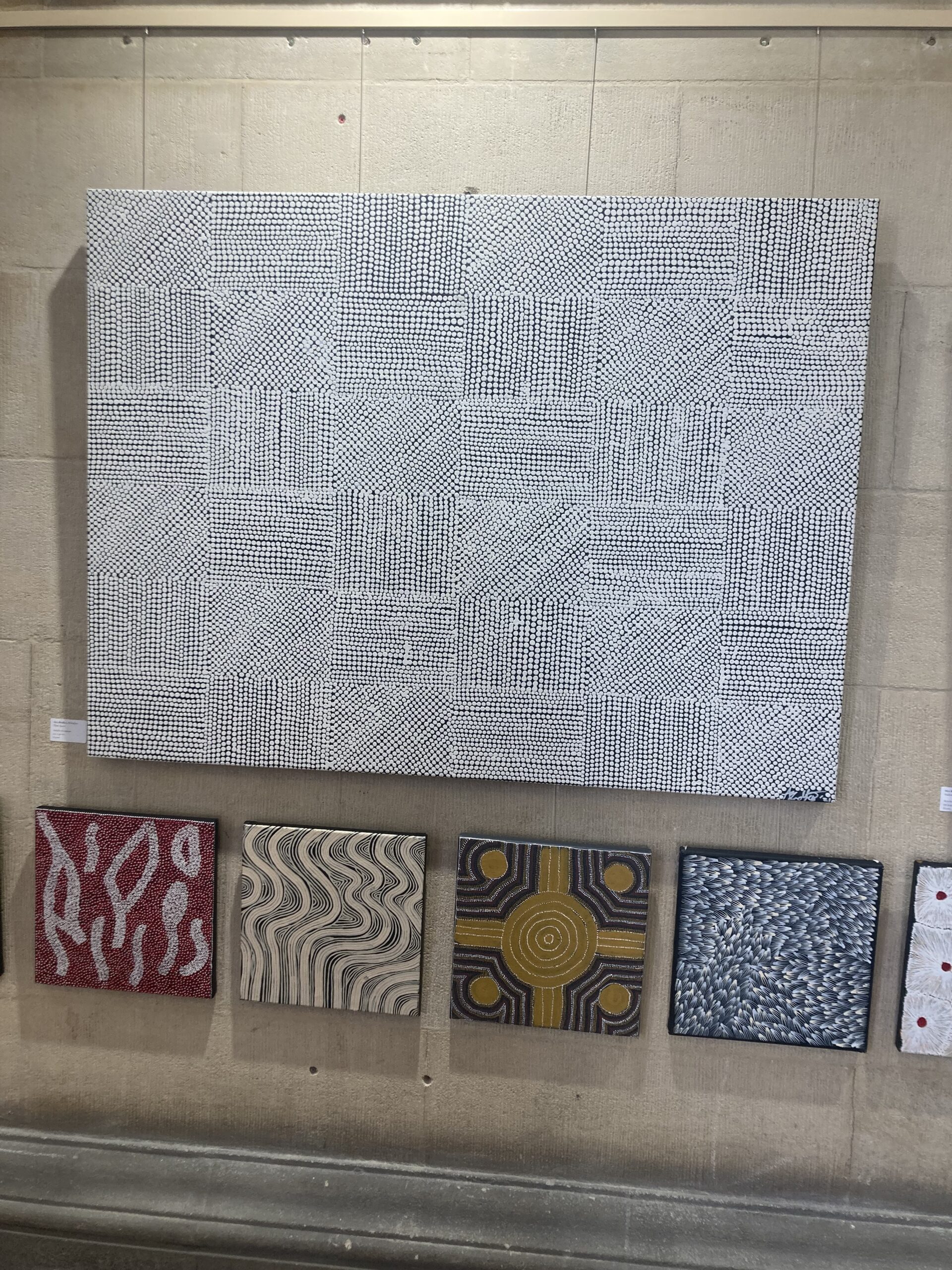 Curated by Coe Gallery, the exhibition features an array of warm earthy tones and vibrant blues and greens, in stylised patterns and beautiful dot formations.