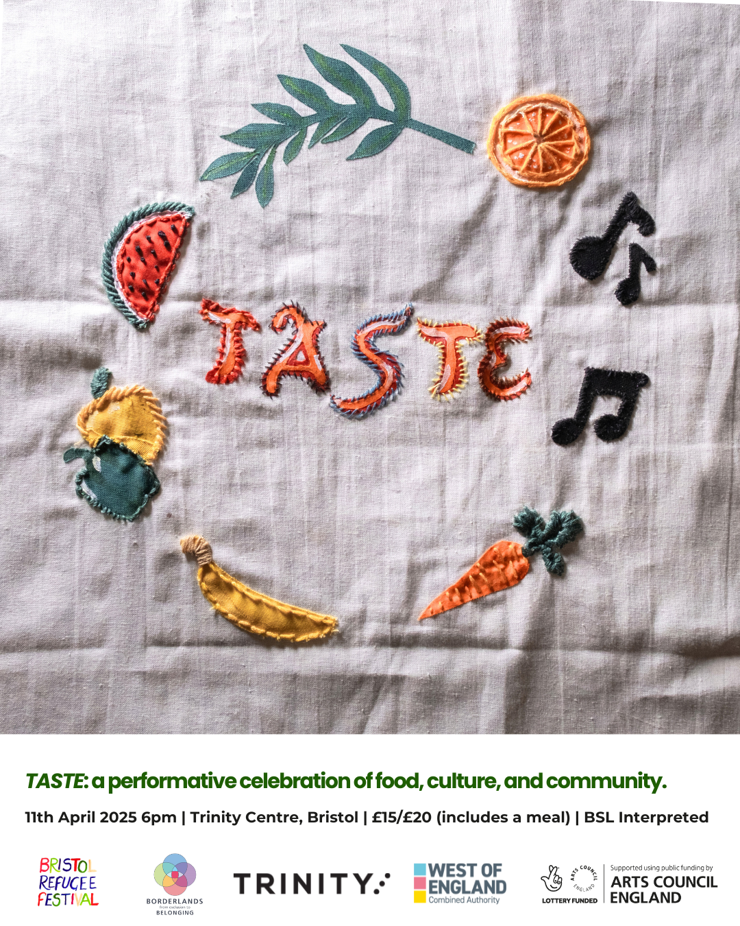 TASTE is at The Trinity Centre on April 11 at 6-9pm. Tickets are available at www.trinitybristol.org.uk – free for BSL users and refugee and asylum seekers. Any ticket holders who require BSL or those with allergies are invited to email with their requirements.