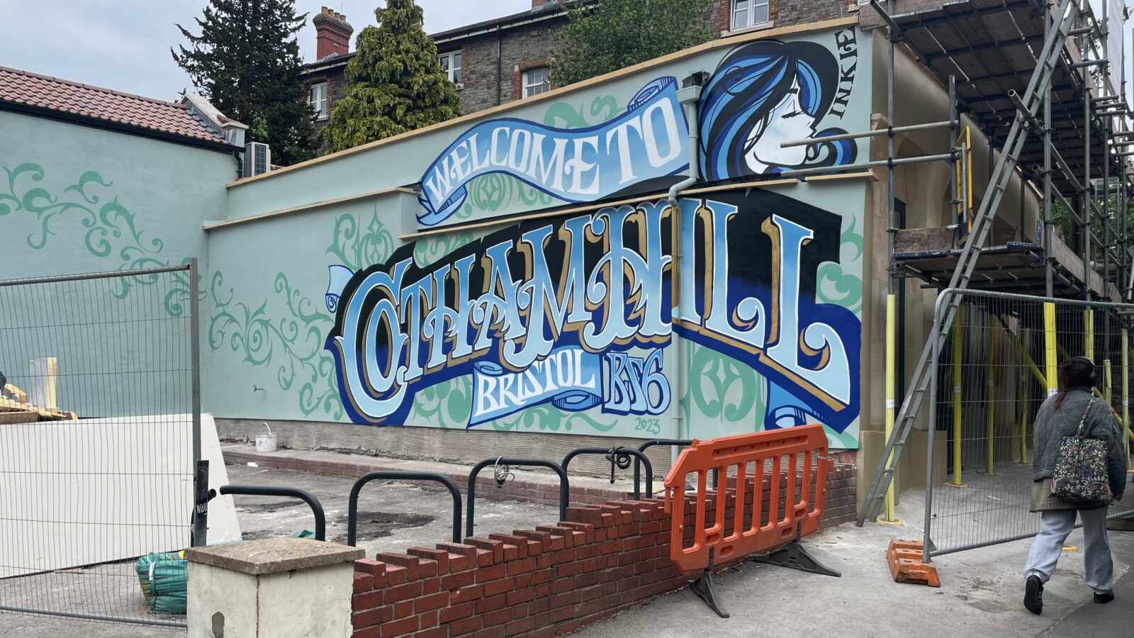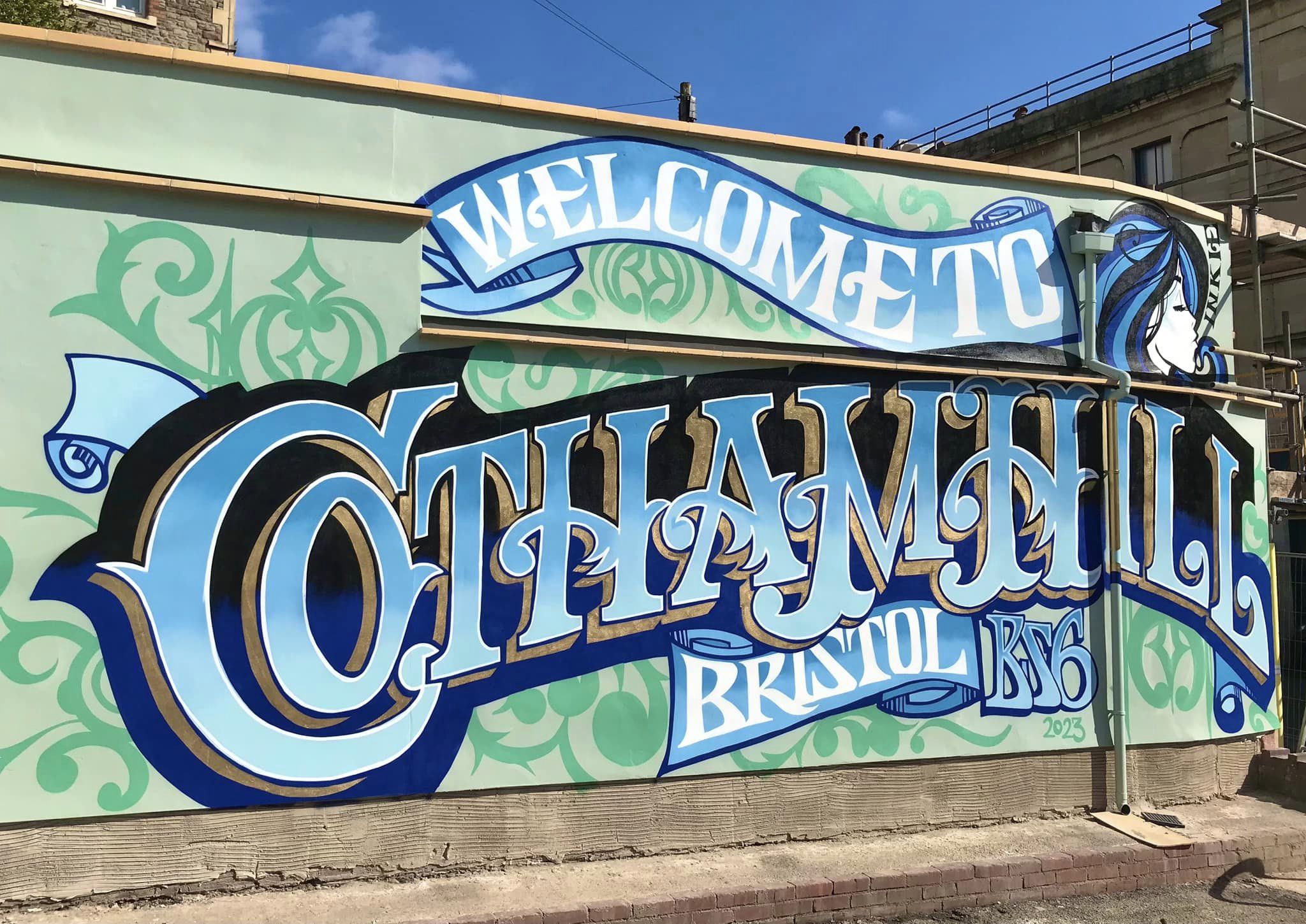 The mural in Inkie’s distinctive lettering and style says: “Welcome to Cotham Hill, Bristol BS6”