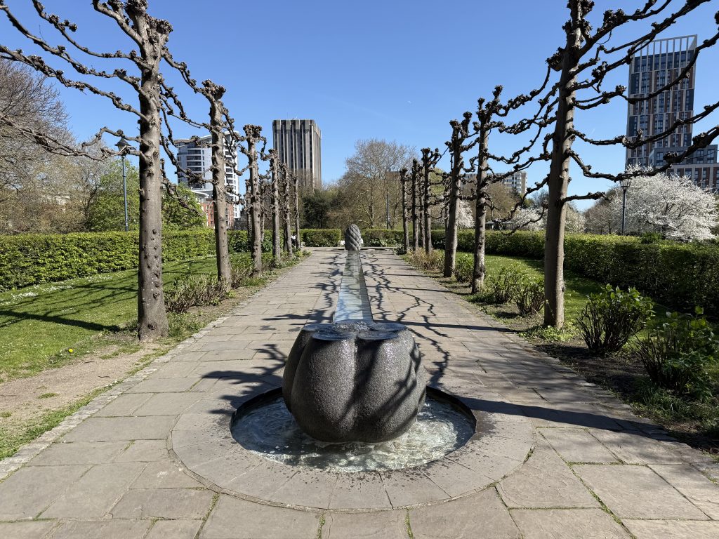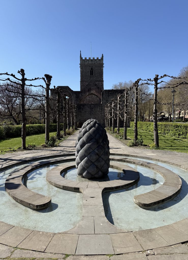 Located in Castle Park, it has a shallow channel of water aligned with the east-west line of the nave of the bombed-out St Peter’s Church.