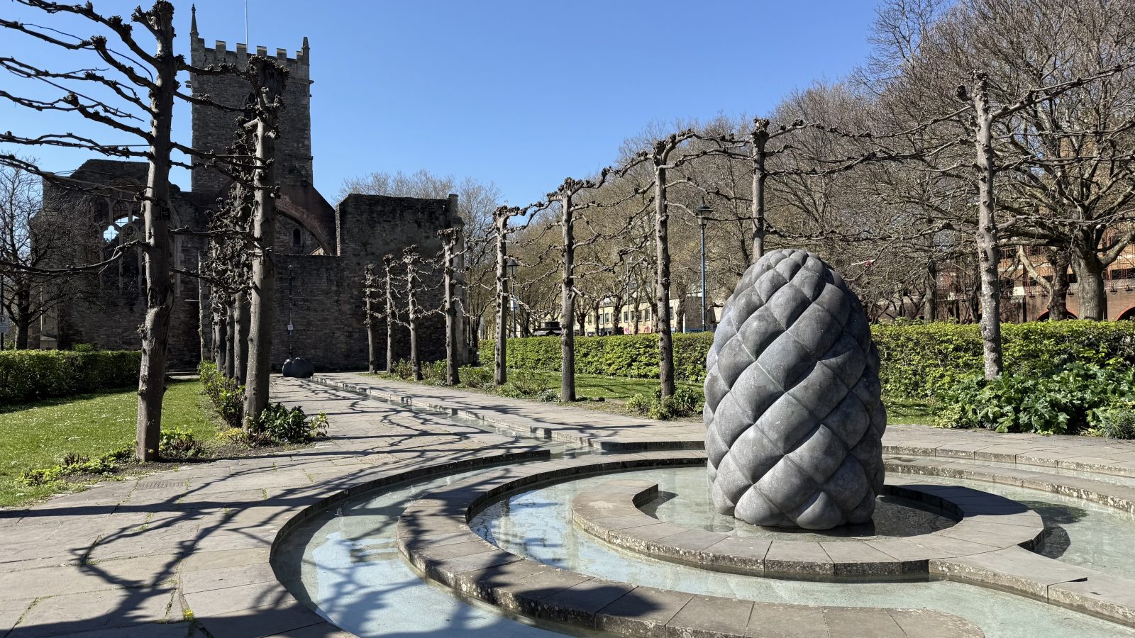 Located in Castle Park, it has a shallow channel of water aligned with the east-west line of the nave of the bombed-out St Peter’s Church.