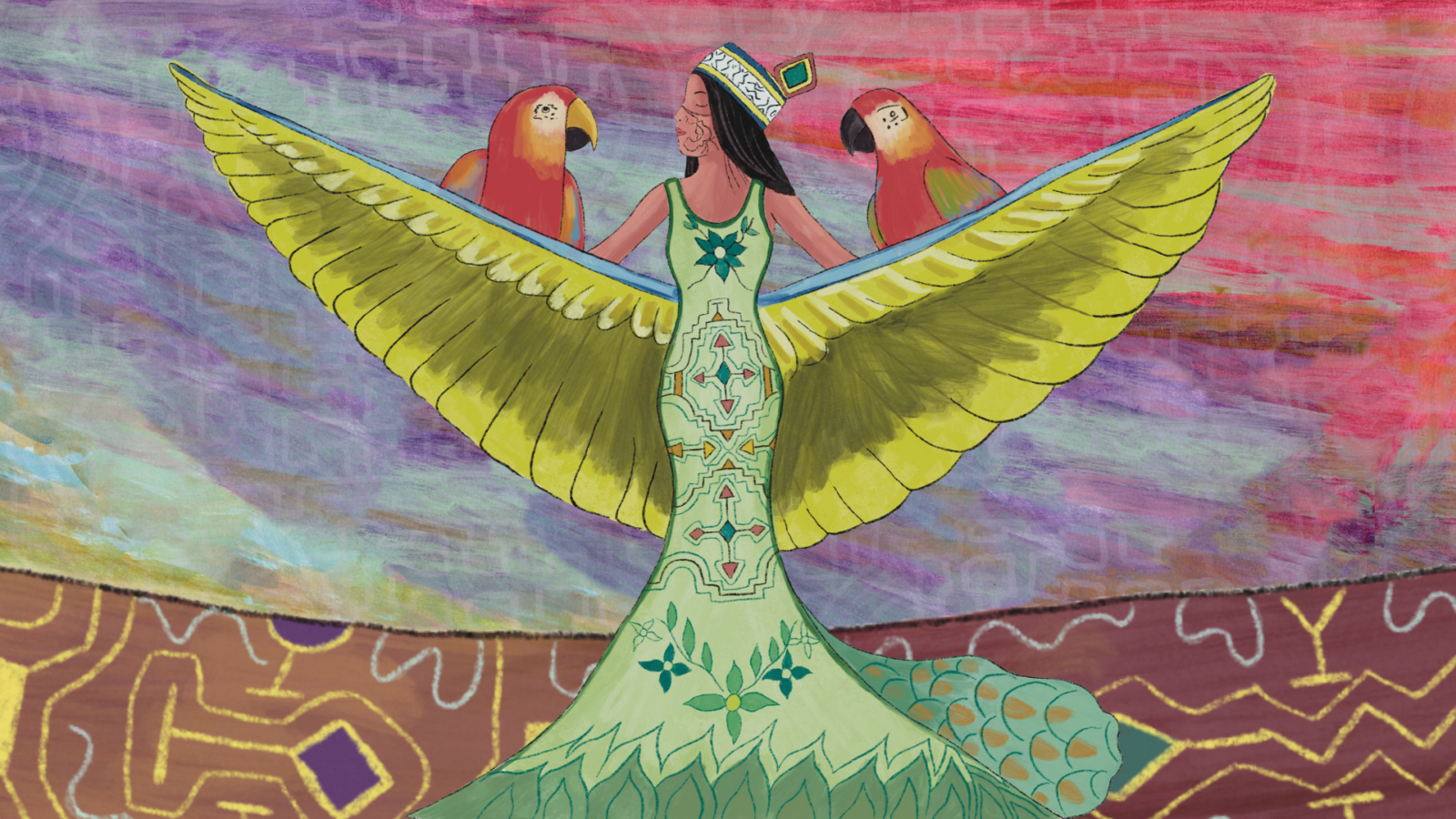 “I grew up in the forest and moved to the city when I was 16, to study. After graduating, I’d like to work at a reforestation programme in my own community. We must look after the forest.” Marta, 19 years old – the Amazon. Art by Guillermo Pëmen – photo: Waves of Change