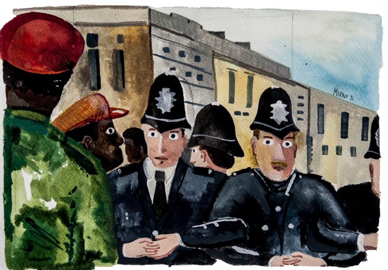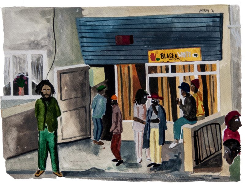 Through six paintings and a poem, they chose to tell the story of a “fairly unremarkable” maisonette in St Paul’s, built on the site of the former Black and White Café: “an important café to the local caribbean community in St Paul’s in the 1980s, but one which gained a national reputation as one of Britain’s most dangerous drug dens”.