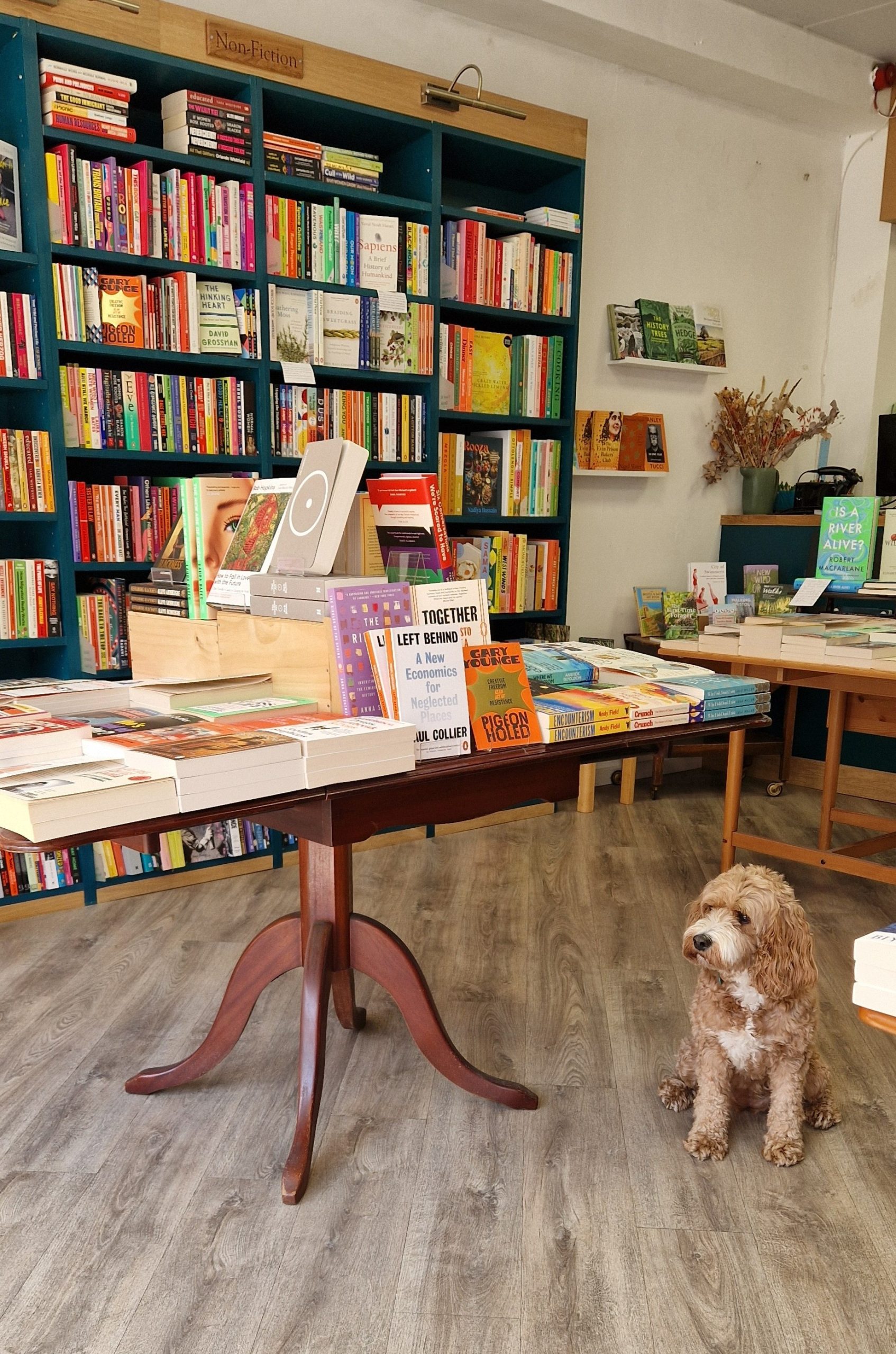 We’re considering another coffee but a delivery of the books we ordered yesterday is here. Two more boxes swiftly arrive – the delivery driver is practically running but still has time to tell us he’s pleased it’s stopped raining. He’s already out of the shop and off.