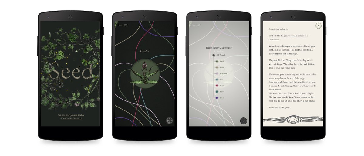 The opportunity to take my writing into the digital realm was both a natural progression and a vital development of the work, not only because Seed’s subject is an impressionable, intelligent teenage girl, grappling with the many cultural influences on her voice and identity, but because I am determined to reach new readers who are digital rather than print-oriented, as well as bringing readers of ‘literary fiction’ to a digital project. My aim in Seed (the digital book) was to create a navigable, non-linear narrative ‘space’. Though Seed is richly visual, I want my reader to have a sense of exploring an environment that could exist only on a digital platform, with a unique sense of orientation and volume inconceivable offline. I wanted to create a story that could only be digitally native.