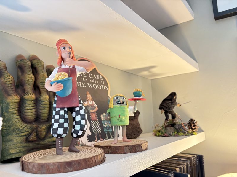 Sculptures of Rene and Glumfoot, handmade by Mikey and his family, are in pride of place on a shelf in his home studio