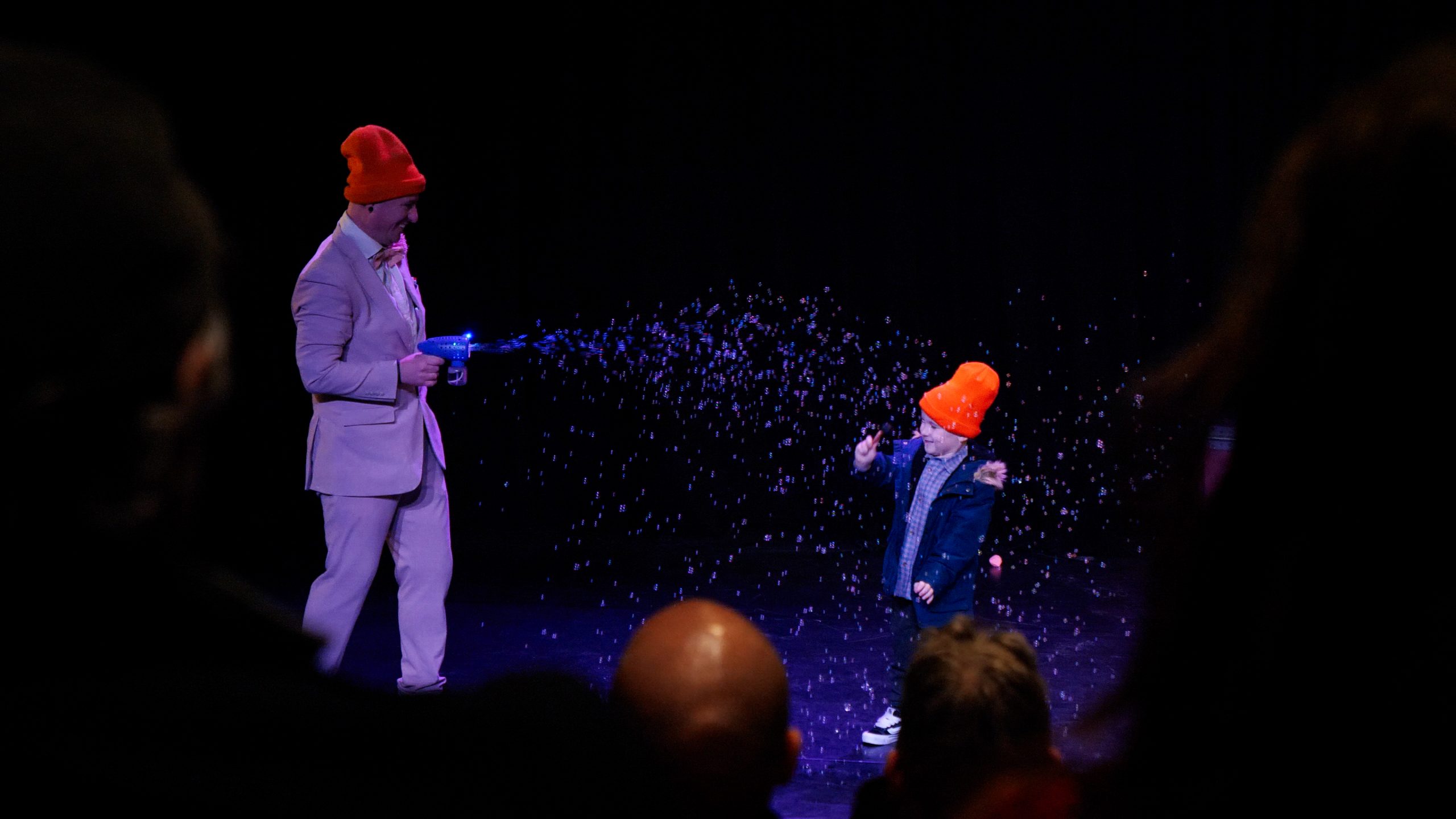 Darryl J Carrington with a young audience volunteer – photo: Kyle Bunby