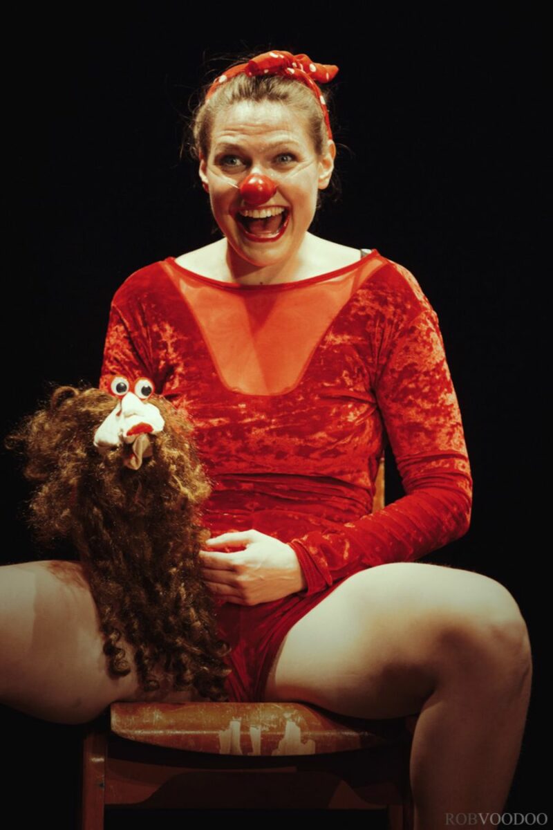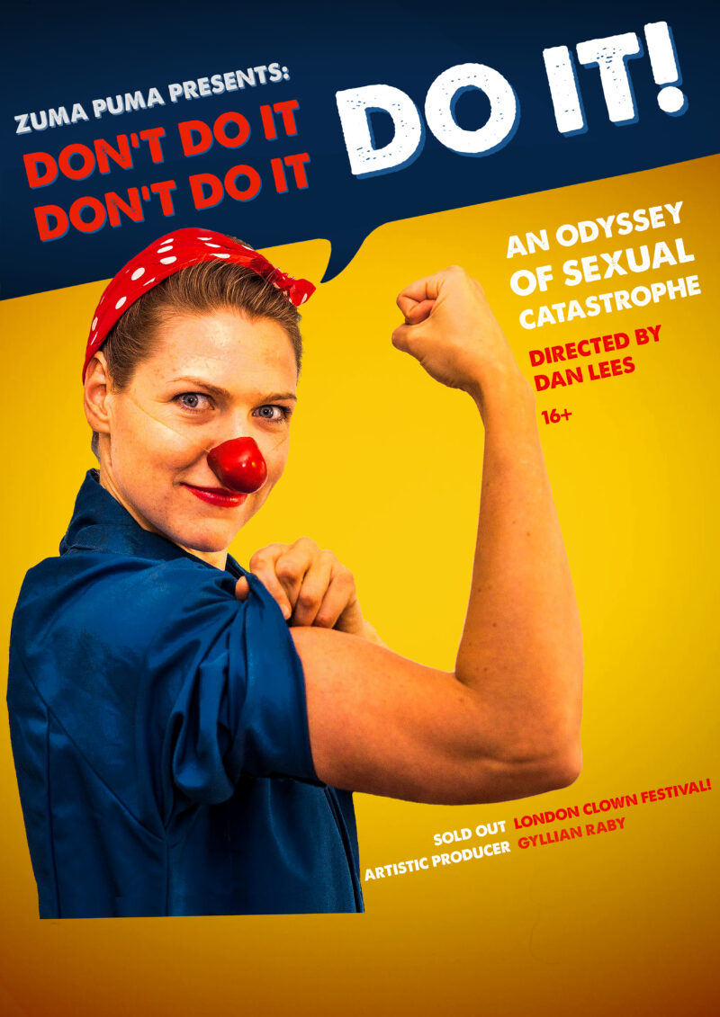 Enter Zuma Puma, real name Nelly Scott. Her style blends traditional clowning forms with mask work, puppetry and music. In Don’t do it, don’t do it, DO IT! Zuma reflects on her own experiences of womanhood through her clowning forms.