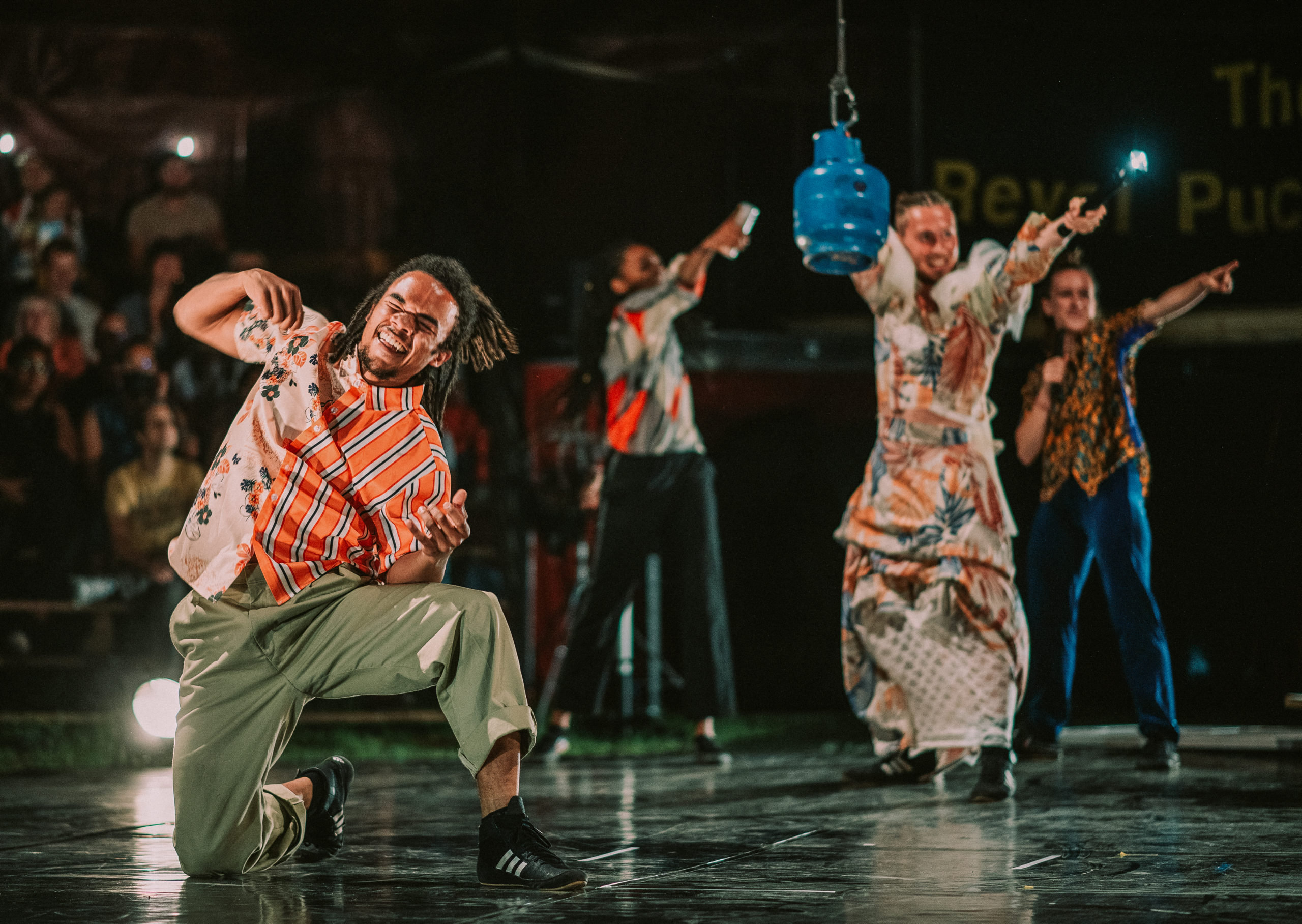 Rather than pretend fear doesn’t exist, Revel Pucks embrace and celebrate their ability to confront it with ridicule, as beautifully demonstrated at the start of the seesaw sequence with a prolonged build-up that got many a fearless child in the audience screaming at the performer to jump off the high ledge.