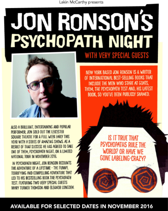 It was around 2009 that Jon started thinking about psychopaths and how both psychologists and clinicians define them. While it might not seem like the most obvious subject for a fun night out, he views it as exactly that, especially when compared to the live shows related to his last book, So You’ve Been Publicly Shamed, about the mob mentality within social media which seems capable of tearing individuals apart for one regrettable error or off-colour remark.