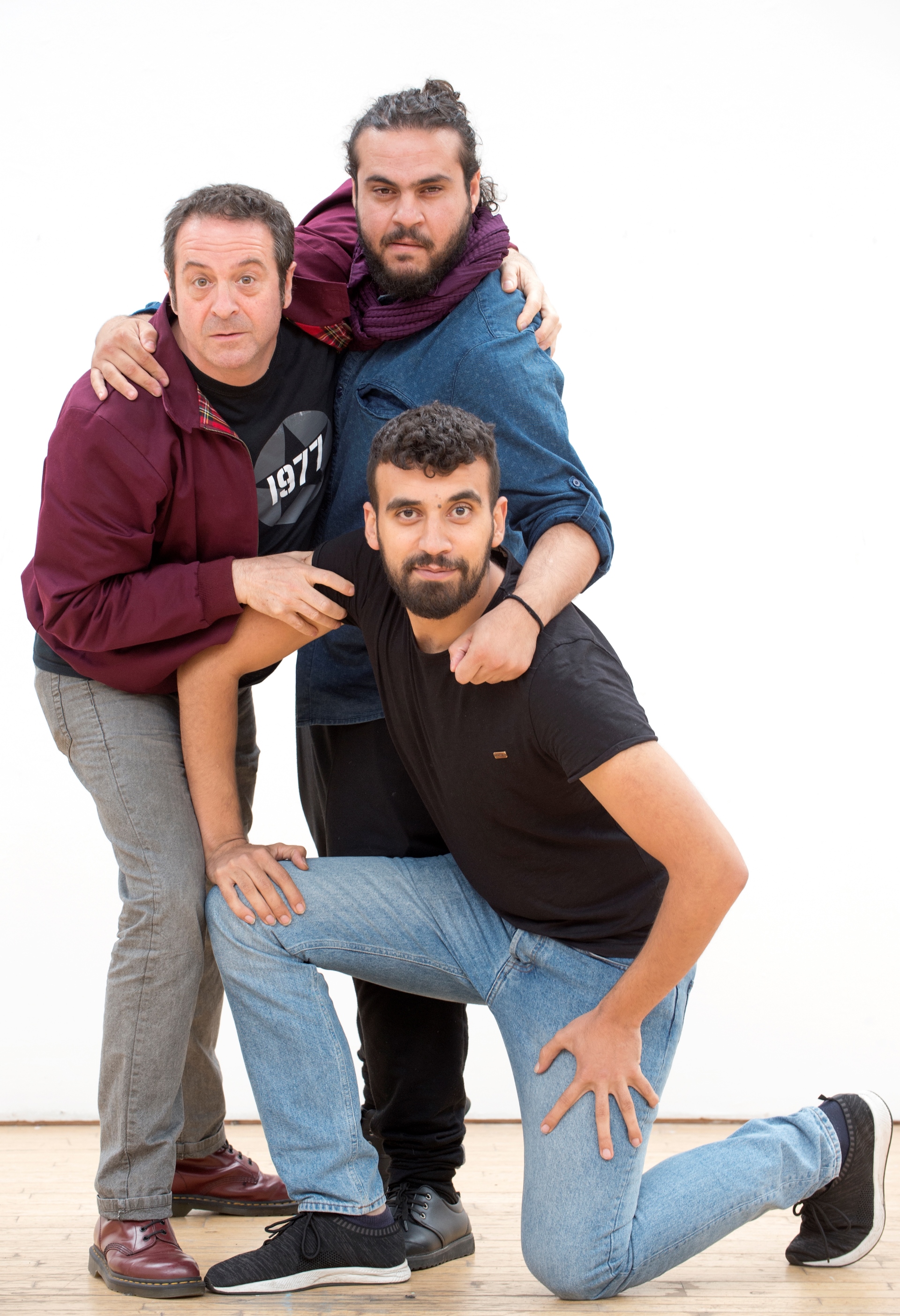 Clockwise from left: Mark Thomas with performers Alaa Shehada and Faisal Abu Alhayjaa. Pics: Lesley Martin
