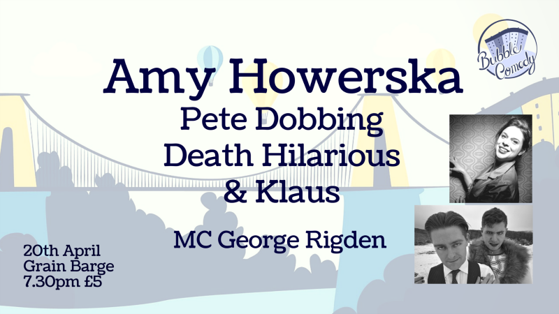 Then there’s local comic Klaus: I’m such a fan that he and fellow Bristol act George Erlanger will be running a monthly comedy open-mic night at the Grain Barge too, starting on May 4. They’re young, enthusiastic, and amazing comedians. We’ve also got one of Bristol’s best comedians, Oppo Comedy’s George Rigden, to host.